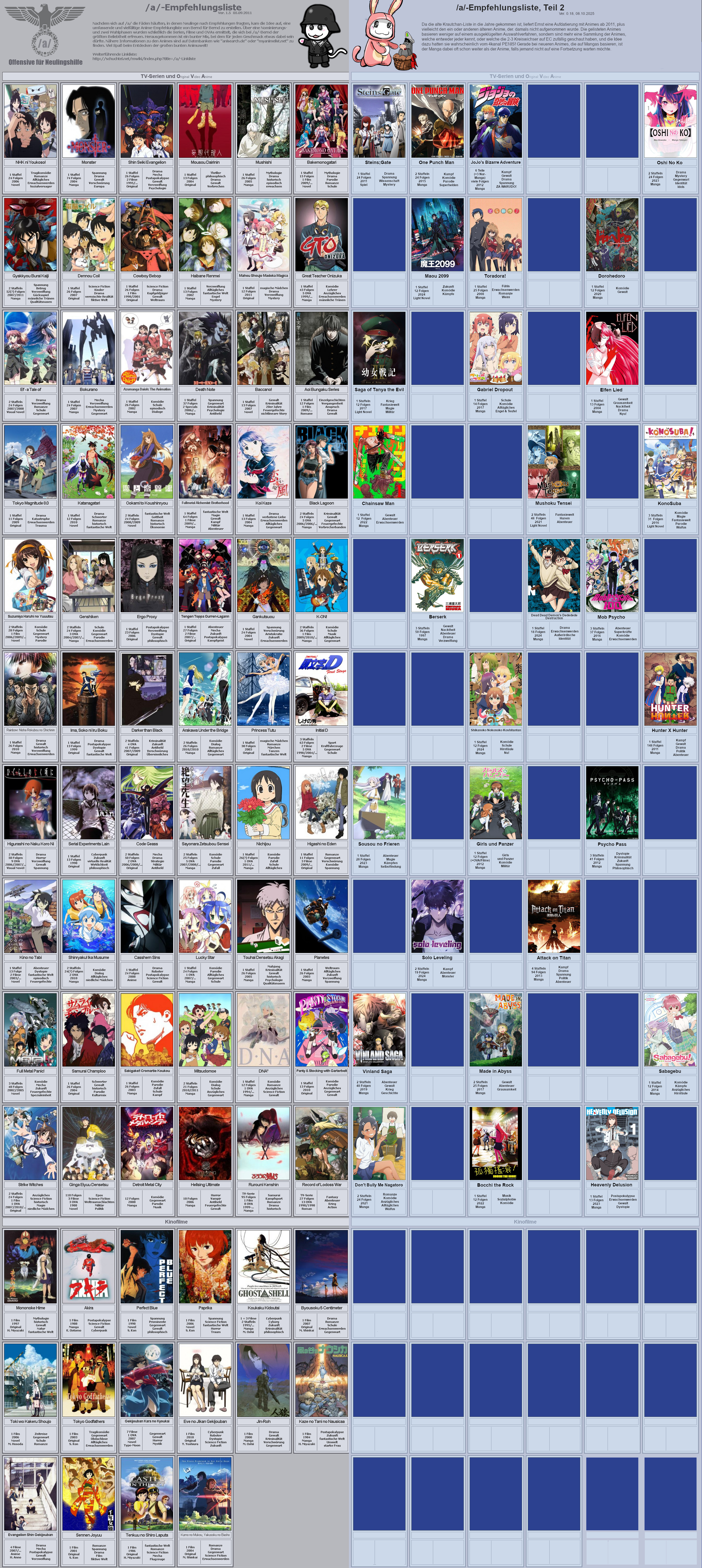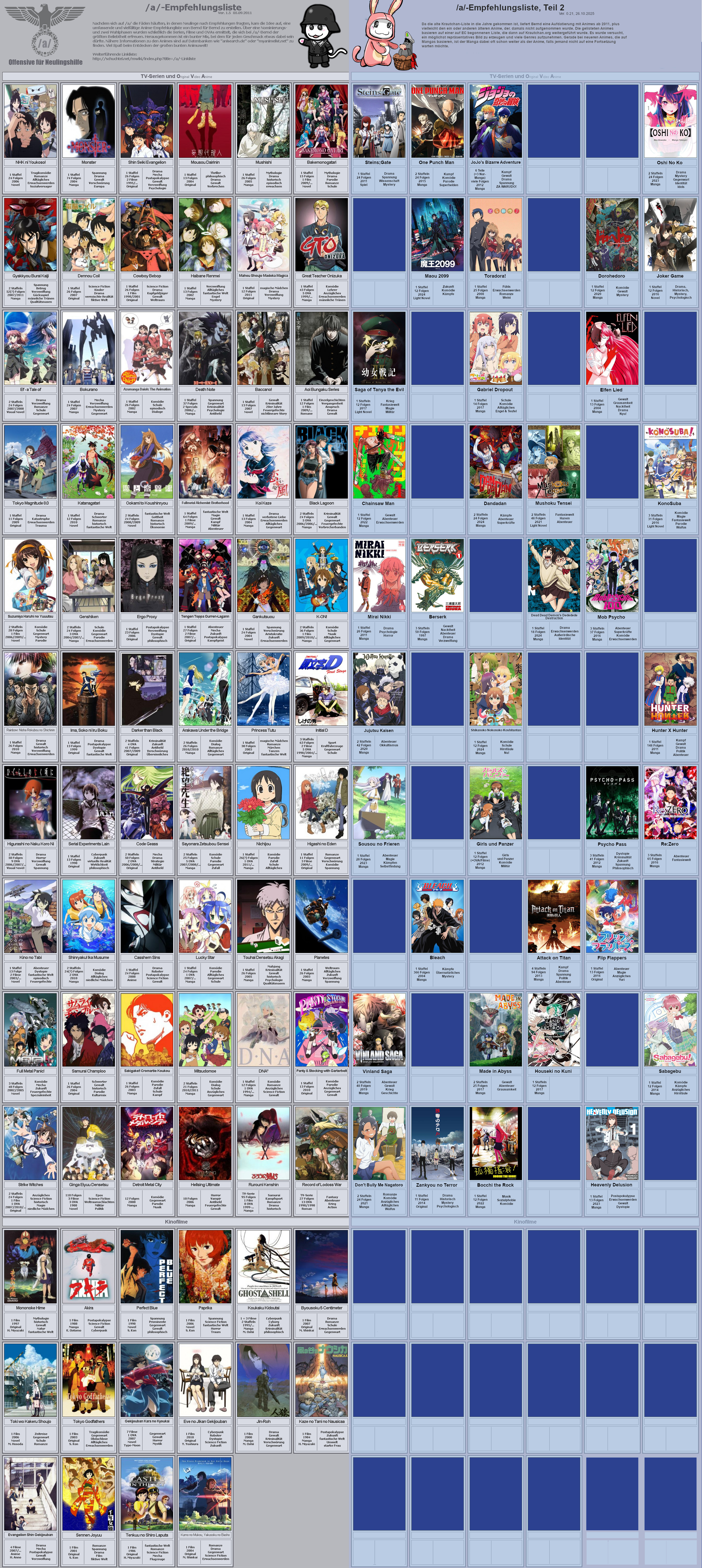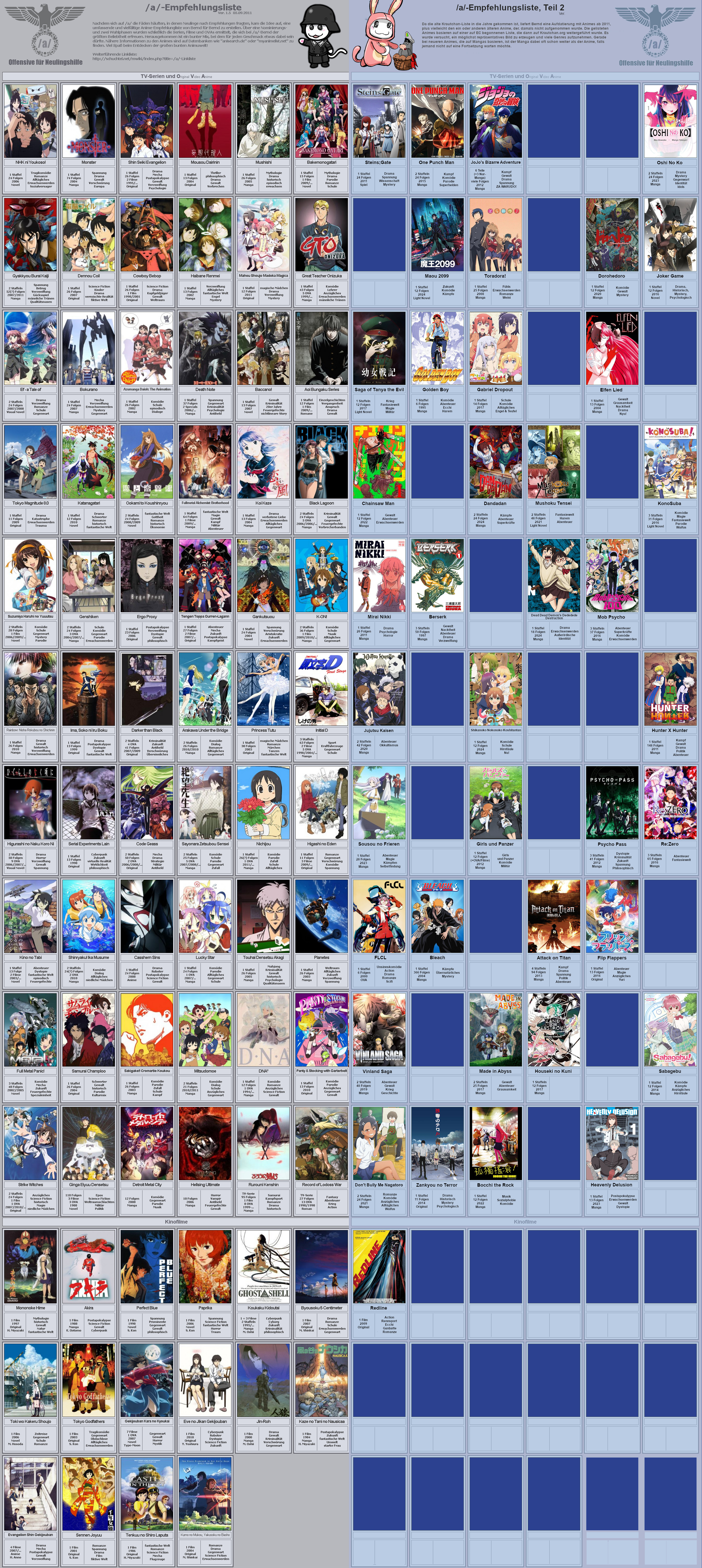 Wie wäre es mit >>415? Nach 10 Folgen ist Bernd durchaus angetan. Und damit wir nicht nur Uralt-Scheiß auf die neue Liste packen: Was ist mit Non Non Biyori? Bernd hat es noch nicht gesehen, ist das tatsächlich gut, oder ist es nur Nyanpasu? >>424 >>429 Bernd hat verstanden, dass 86 und City Hunter auf jeden Fall drauf sollen, und bei Duradura und Blood+ eventuell noch Diskussionsbedarf ist? Er kümmert sich die Tage um die neuen Einträge. Hier mal eine aufdatierte Liste, was schon alles drauf ist. Alte Liste Anime: NHK, Monster, Neon Genesis Evangelion, Mousou Dairinin, Mushishi, Bakemonogatari, Gyakkyou Buraj Kaiji, Dennou Coil, Cowboy Bebop, Haibane Renmei, Madoka Magica, Great Teacher Onizuka, Ef - A Tale Of, Bokurano, Azumanga Daioh, Death Note, Baccano, Aoi Bungaku Series, Tokyo Magnitude 8.0, Katanagatari, Ookami to Koushinryou, Fullmetal Alchemist Brotherhood, Koi Kaze, Black Lagoon, Suzumiya Haruhi No Yuuutsu, Genshiken, Ergo Proxy, Tengen Toppa Gurren Lagann, Gankutsuou, K-ON, Rainbow Nisha Rokubou no Shichinin, Ima Soko Ni Iru Boku, Darker Than Black, Arakawa Under the Bridge, Princess Tutu, Initial D, Hirugashi No Nako Koro Ni, Serial Experiments Lain, Code Geass, Sayonara Zetsubou Sensei, Nichijou, Higashi No Eden, Kino No Tabi, Shinryaku! Ika Musume, Casshern Sins, Lucky Star, Touhai Densetsu Akagi, Planetes, Full Metal Panic, Samurai Champloo, Sakigae! Cromartie Koukou, Mitsudomoe, DNA, Panty&Stocking with Garterbelt, Strike Witches, Ginga Eiyuu Densetsu, Detroit Metal City, Hellsing Ultimate, Rurouni Kenshin, Record of Lodoss War Alte Liste Filme: Mononoke Hime, Akira, Perfect Blue, Paprika, Koukaku Kidoutai Byousoku 5 Centimeter, Toki Wo Kakeru Shoujo, Tokyo Godfathers, Gekijouban Kara No Kyoukai, Eve No Jikan Gekijouban, Jin-Roh, Kaze No Tani No Nausicaa, Evangelion Shin Gekijouban, Sennen Joyuu, Tenkuu No Shiro Laputa, Kumo No Mukou, Yakusoku No Basho Neue Liste: Steins;Gate, One Punch Man, JoJo's Bizarre Adventure, Oshi No Ko, Maou 2099, Toradora!, Dorohedoro, Saga of Tanya the Evil, Gabriel Dropout, Elfen Lied, Chainsaw Man, Mushoku Tensei, KonoSuba, Berserk Dead Dead Demons DeDeDeDe Destruction, Mob Psycho, Shikanoko Nokonoko Koshitantan, Hunter X Hunter, Sousou No Frieren, Girls und Panzer, Psycho Pass, Attack on Titan, Vinland Saga, Made in Abyss, Sabagebu, Don't Bully Me Nagatoro, Bocchi the Rock, Heavenly Delusion, Flip Flappers, Mirai Nikki, Jujutsu Kaisen, Re:Zero, Dandadan, Bleach, Houseki no Kuni, Terror in Tokio, Joker Game, Golden Boy, FLCL Neue Liste Filme: Redline