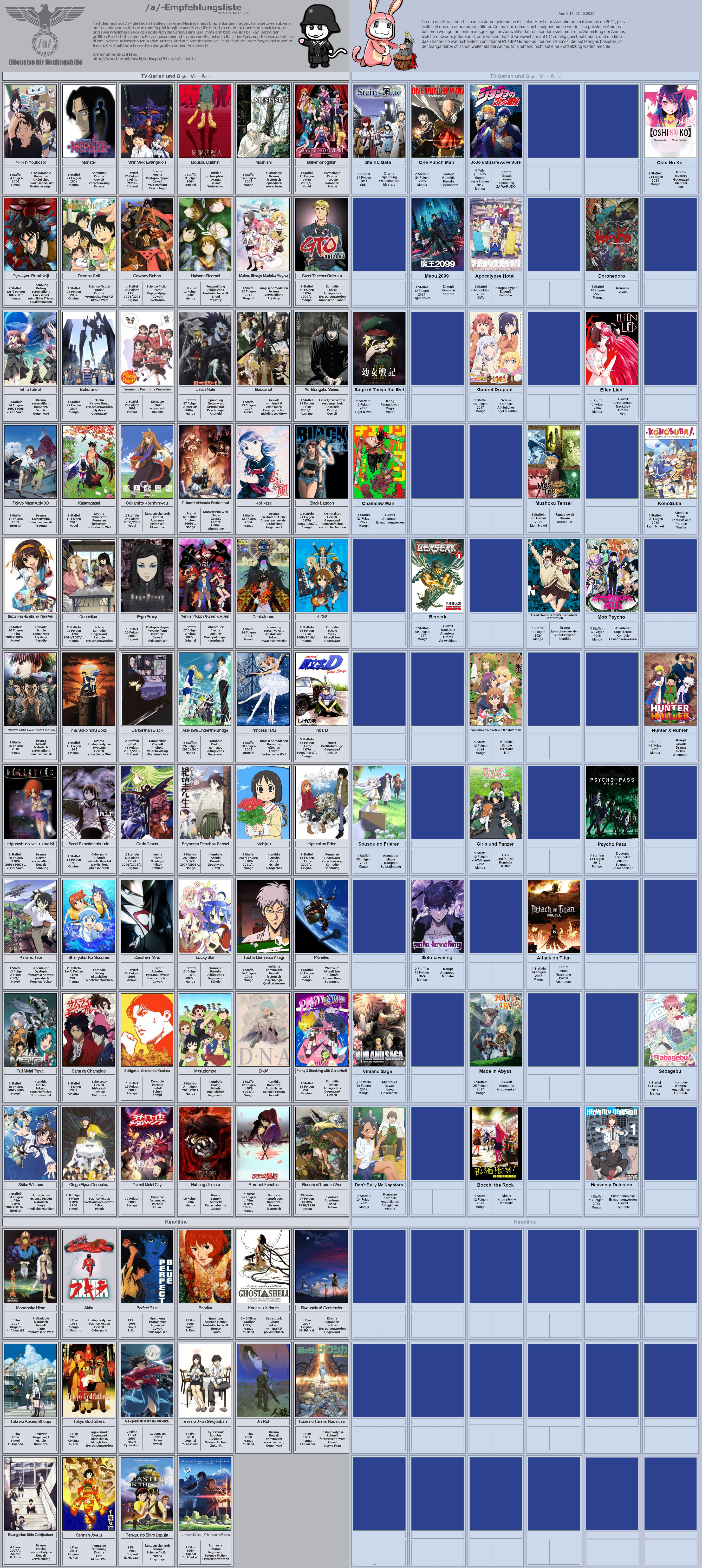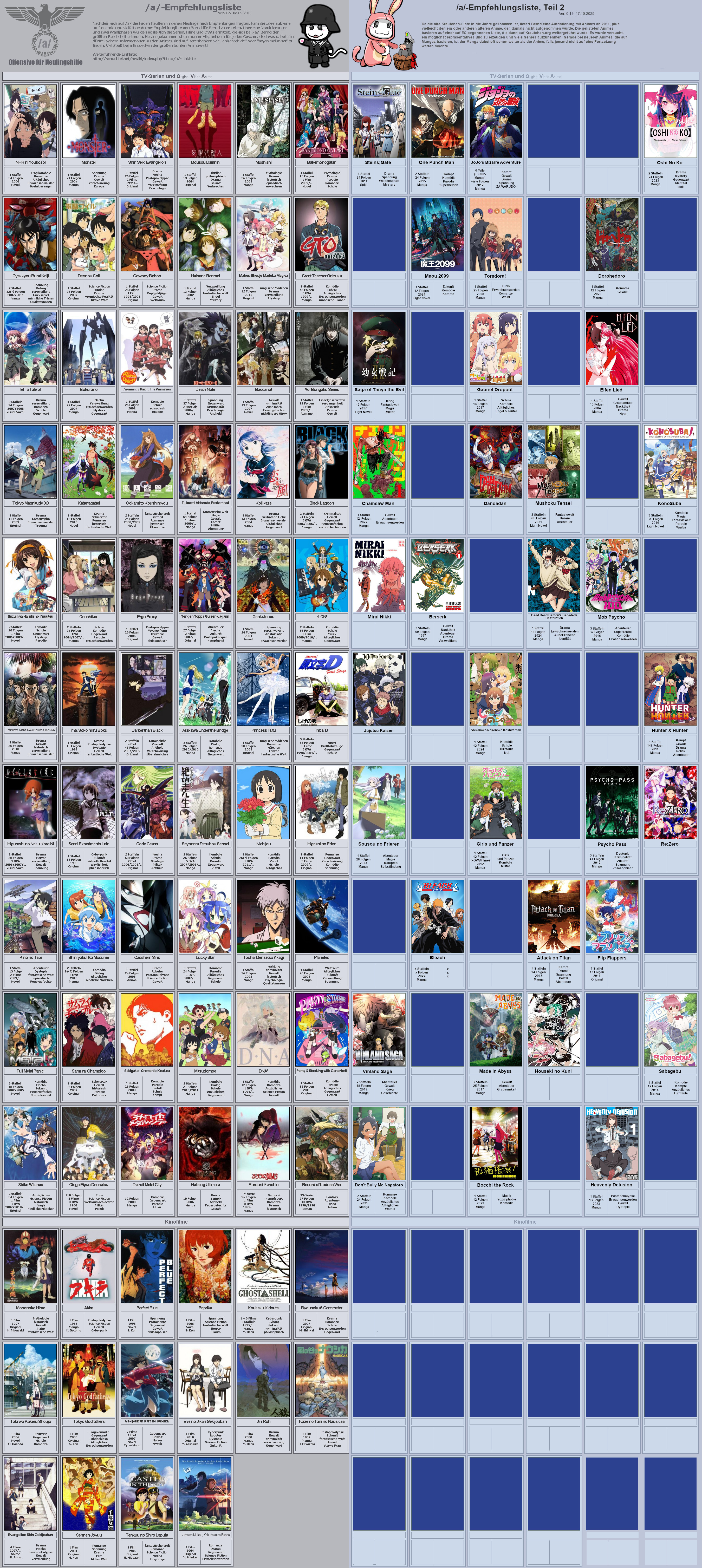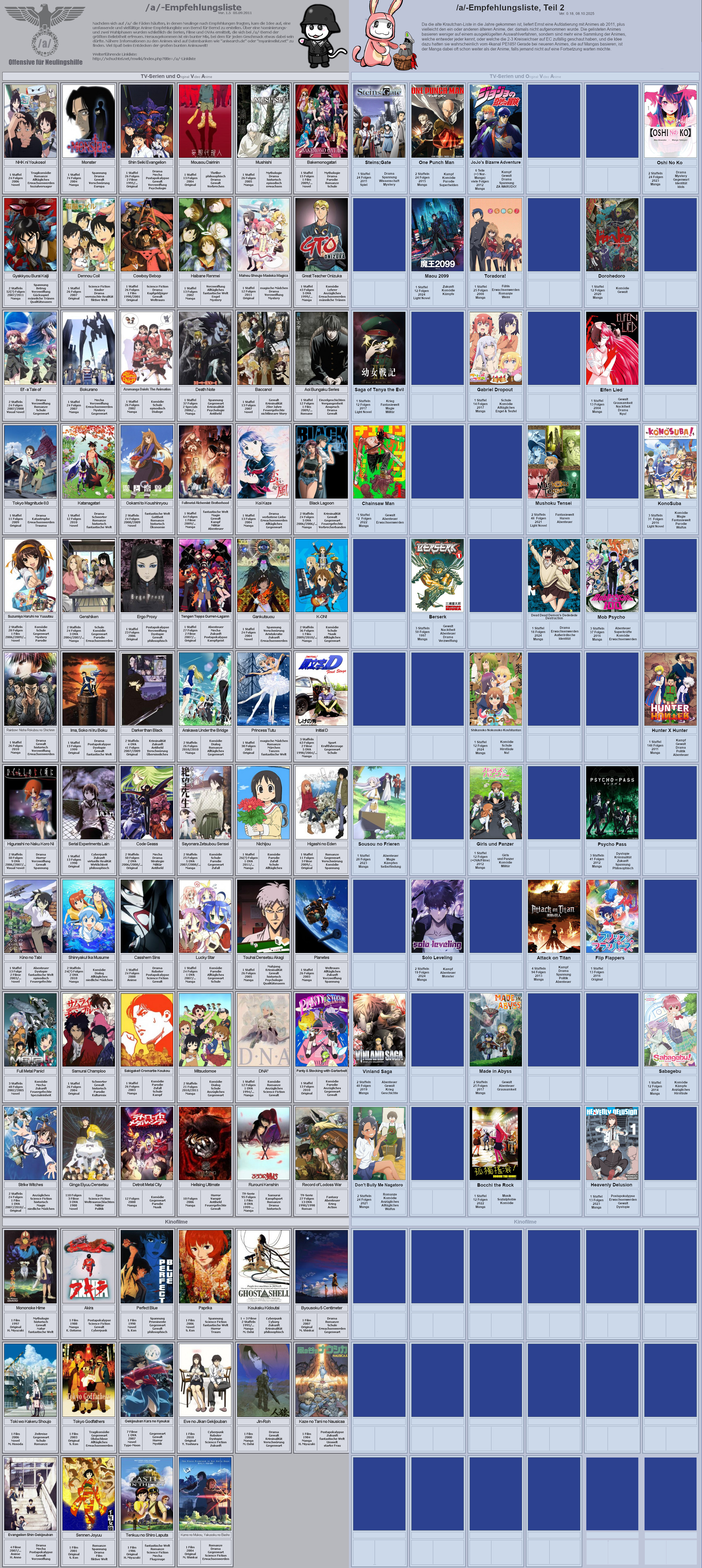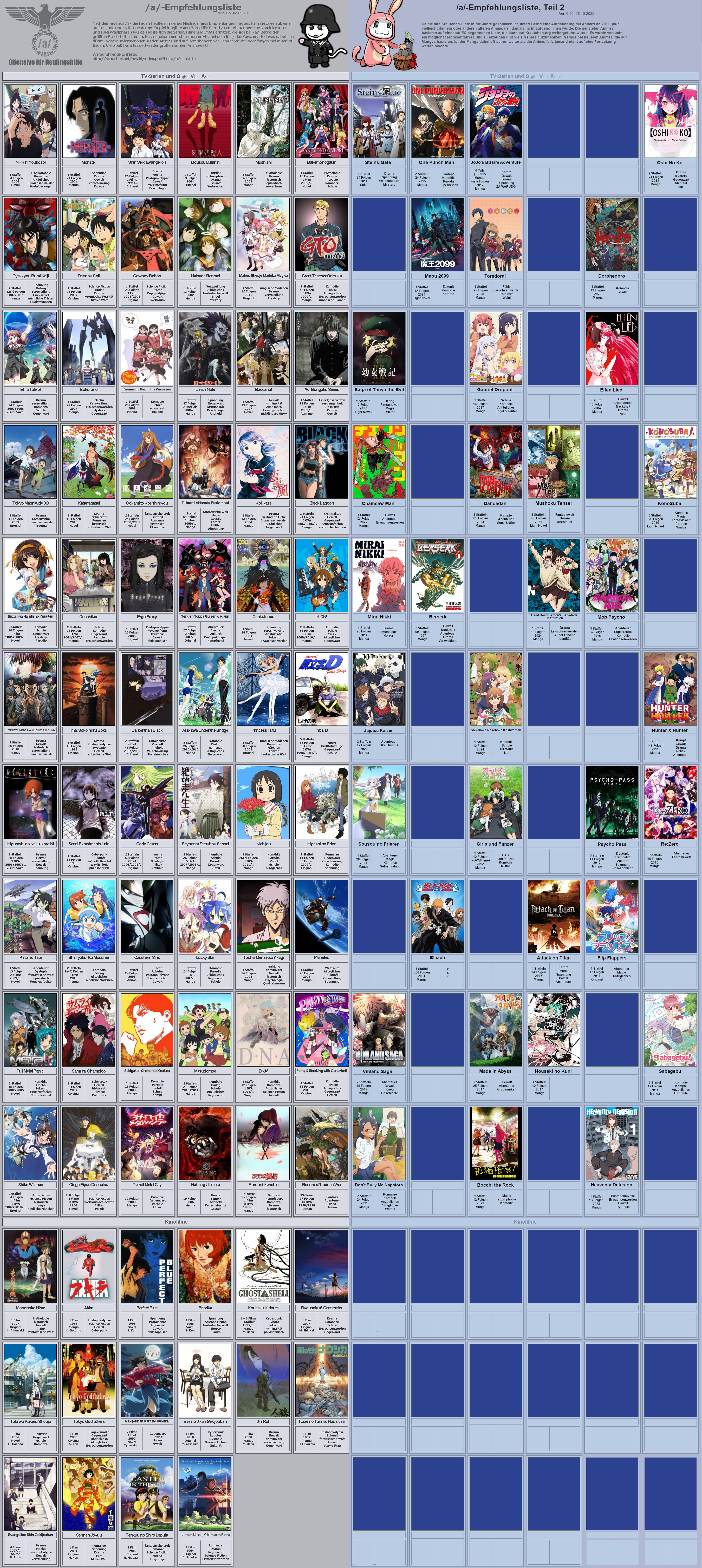 Wie wäre es mit >>415? Nach 10 Folgen ist Bernd durchaus angetan. Und damit wir nicht nur Uralt-Scheiß auf die neue Liste packen: Was ist mit Non Non Biyori? Bernd hat es noch nicht gesehen, ist das tatsächlich gut, oder ist es nur Nyanpasu? >>424 >>429 Bernd hat verstanden, dass 86 und City Hunter auf jeden Fall drauf sollen, und bei Duradura und Blood+ eventuell noch Diskussionsbedarf ist? Er kümmert sich die Tage um die neuen Einträge. Hier mal eine aufdatierte Liste, was schon alles drauf ist. Alte Liste Anime: NHK, Monster, Neon Genesis Evangelion, Mousou Dairinin, Mushishi, Bakemonogatari, Gyakkyou Buraj Kaiji, Dennou Coil, Cowboy Bebop, Haibane Renmei, Madoka Magica, Great Teacher Onizuka, Ef - A Tale Of, Bokurano, Azumanga Daioh, Death Note, Baccano, Aoi Bungaku Series, Tokyo Magnitude 8.0, Katanagatari, Ookami to Koushinryou, Fullmetal Alchemist Brotherhood, Koi Kaze, Black Lagoon, Suzumiya Haruhi No Yuuutsu, Genshiken, Ergo Proxy, Tengen Toppa Gurren Lagann, Gankutsuou, K-ON, Rainbow Nisha Rokubou no Shichinin, Ima Soko Ni Iru Boku, Darker Than Black, Arakawa Under the Bridge, Princess Tutu, Initial D, Hirugashi No Nako Koro Ni, Serial Experiments Lain, Code Geass, Sayonara Zetsubou Sensei, Nichijou, Higashi No Eden, Kino No Tabi, Shinryaku! Ika Musume, Casshern Sins, Lucky Star, Touhai Densetsu Akagi, Planetes, Full Metal Panic, Samurai Champloo, Sakigae! Cromartie Koukou, Mitsudomoe, DNA, Panty&Stocking with Garterbelt, Strike Witches, Ginga Eiyuu Densetsu, Detroit Metal City, Hellsing Ultimate, Rurouni Kenshin, Record of Lodoss War Alte Liste Filme: Mononoke Hime, Akira, Perfect Blue, Paprika, Koukaku Kidoutai Byousoku 5 Centimeter, Toki Wo Kakeru Shoujo, Tokyo Godfathers, Gekijouban Kara No Kyoukai, Eve No Jikan Gekijouban, Jin-Roh, Kaze No Tani No Nausicaa, Evangelion Shin Gekijouban, Sennen Joyuu, Tenkuu No Shiro Laputa, Kumo No Mukou, Yakusoku No Basho Neue Liste: Steins;Gate, One Punch Man, JoJo's Bizarre Adventure, Oshi No Ko, Maou 2099, Toradora!, Dorohedoro, Saga of Tanya the Evil, Gabriel Dropout, Elfen Lied, Chainsaw Man, Mushoku Tensei, KonoSuba, Berserk Dead Dead Demons DeDeDeDe Destruction, Mob Psycho, Shikanoko Nokonoko Koshitantan, Hunter X Hunter, Sousou No Frieren, Girls und Panzer, Psycho Pass, Attack on Titan, Vinland Saga, Made in Abyss, Sabagebu, Don't Bully Me Nagatoro, Bocchi the Rock, Heavenly Delusion, Flip Flappers, Mirai Nikki, Jujutsu Kaisen, Re:Zero, Dandadan, Bleach, Houseki no Kuni, Terror in Tokio, Joker Game, Golden Boy, FLCL Neue Liste Filme: Redline