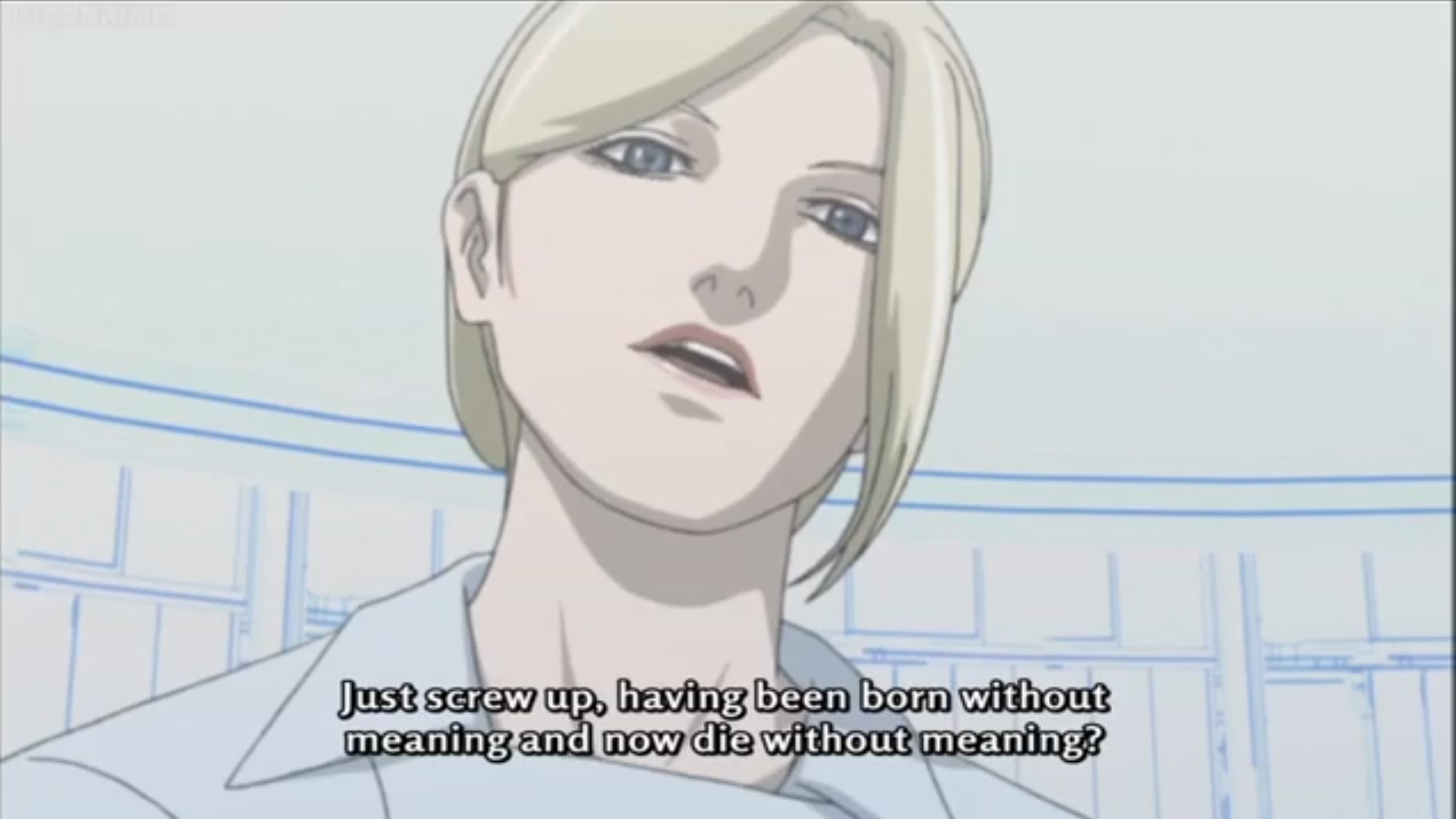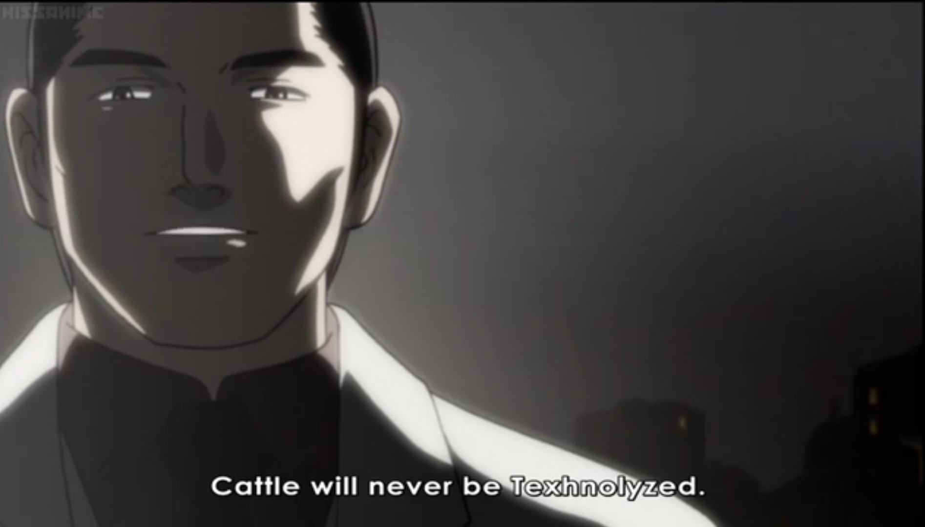 Bernd hat mit Texhnolyze begonnen, einem Animu von 2003, 22 Folgen. Bernd hat gesehen, dass das im selben Atemzug genannt wurde wie Ergo Proxy, was Bernd recht gut fand, und er mag generell Wissenschaftsfiktion und Dystopien. Geschichte ist ungefähr so: In einer futuristischen, aber auch runtergekommenen und von der Mafia regierten Stadt, Midgar-Style, kriegt ein junger Preisboxer Ärger mit einem Kampfveranstalter, und verliert dabei Arm und Bein. Er wird halbtot von einer Ärztin aufgegriffen, die ihm die sonst für die reiche Oberschicht vorbehaltenen Techno-Prothesen verpasst, die wohl sehr leistungsfähig sind. Parallel gibt es eine Gruppe von Fanatikern, welche die Techno-Prothesen ablehnen. Die Prothesen kann man auch irgendwie nur in dieser Stadt herstellen, weil es nur dort einen bestimmten Rohstoff gibt, darüber wurde noch nicht viel erklärt, Bernd stellt es sich vor wie das Spice von Dune. Außerdem gibt es den Mafiaboss, der sich ungefähr so benimmt, wie man es von einem Mafiaboss erwarten würde: Abgeklärt, aber skrupellos. Es gibt auch noch eine Gruppe, die im Untergrund lebt, bei der ein Mädchen lebt, welches die Zukunft sehen kann, und einen Reisenden von außerhalb der Stadt, bei dem impliziert wird, dass er eine große Nummer ist, und der Kontakt mit einer rivalisierenden Mafiafamilie sucht.