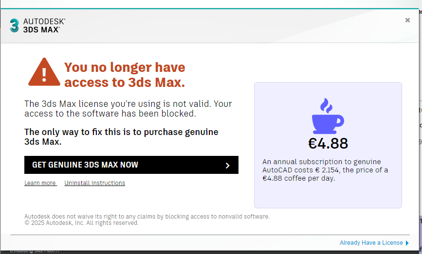 Früher konnte man noch gepflegt raubmordkopieren. Heute wird man detektiert, obwohl man die ganzen Verbindungen zu Autodesk blockiert. Muss Bernd sich wohl doch in Blender einarbeiten. ;_;
