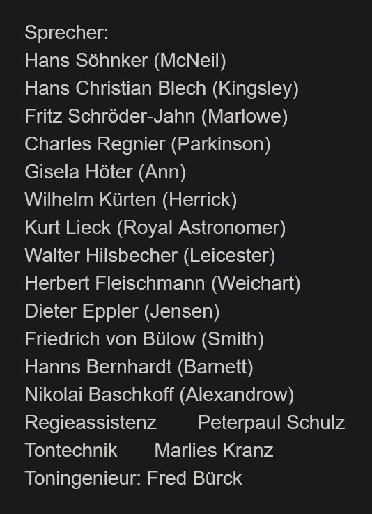 >>14791 Sprecher/Sprecherin Rolle/Funktion Hans Söhnker McNeil Hans Christian Blech Kingsley Fritz Schröder-Jahn Marlowe Charles Regnier Parkinson Gisela Höter Ann Wilhelm Kürten Herrick Kurt Lieck Royal Astronomer Walter Hilsbecher Leicester Herbert Fleischmann Weichart Dieter Eppler Jensen Friedrich von Bülow Smith Hanns Bernhardt Barnett