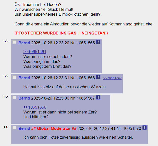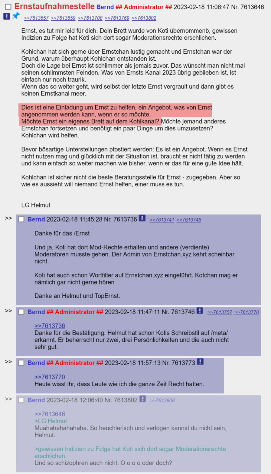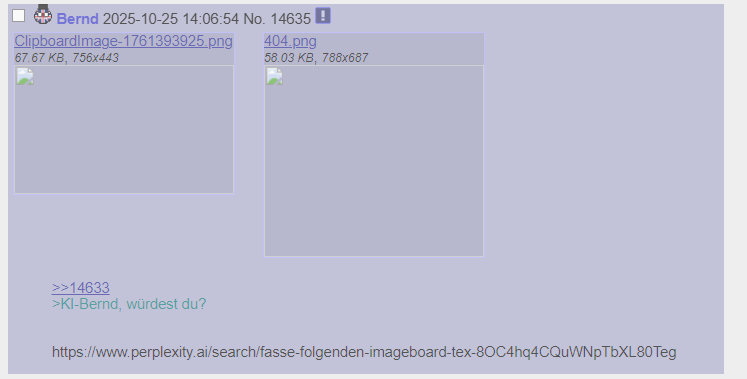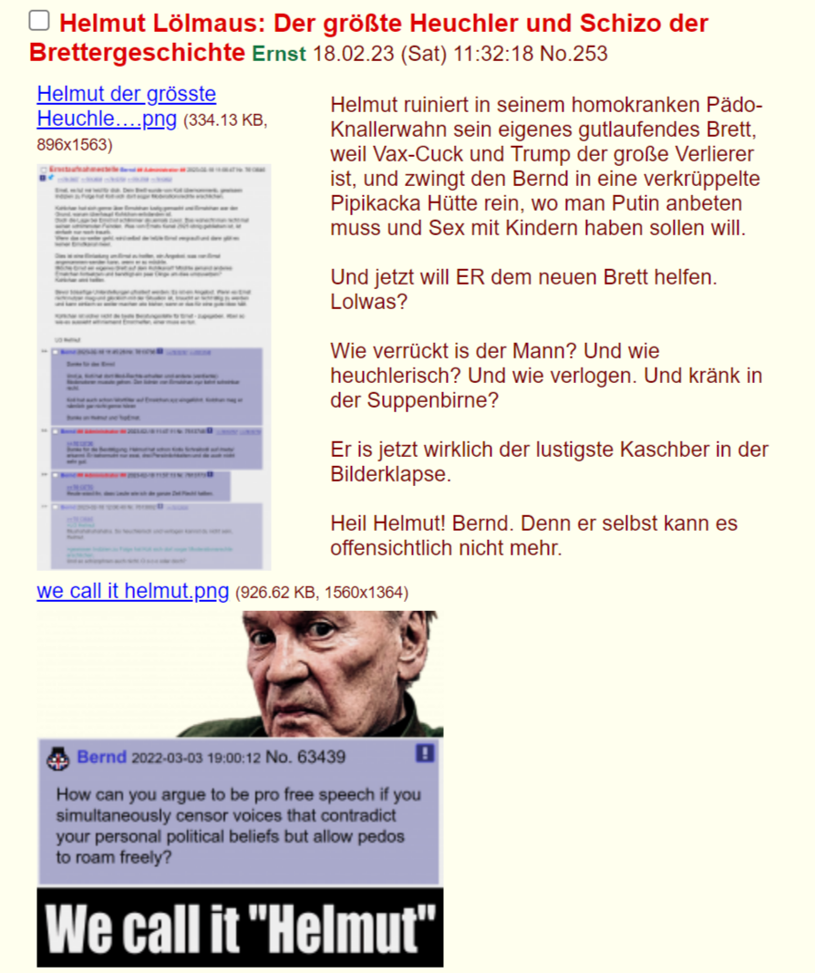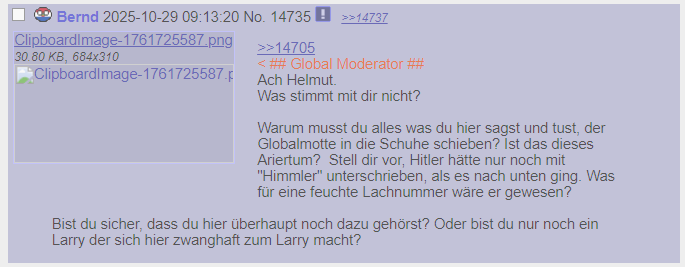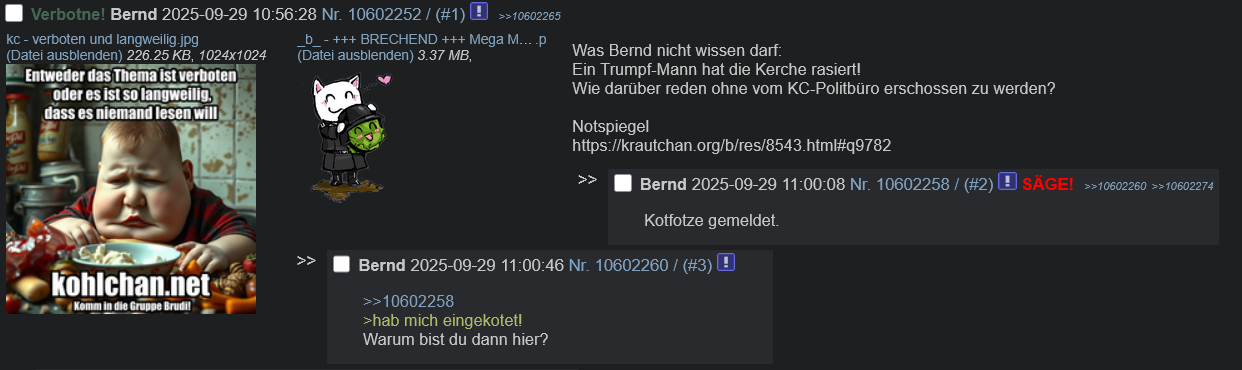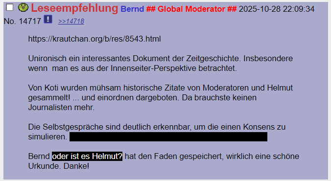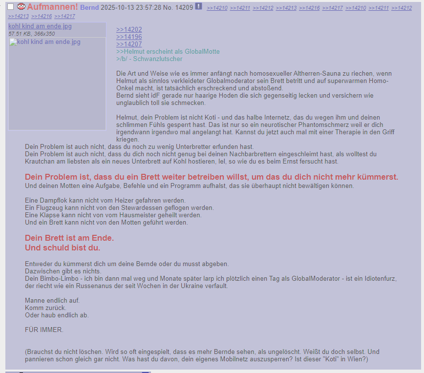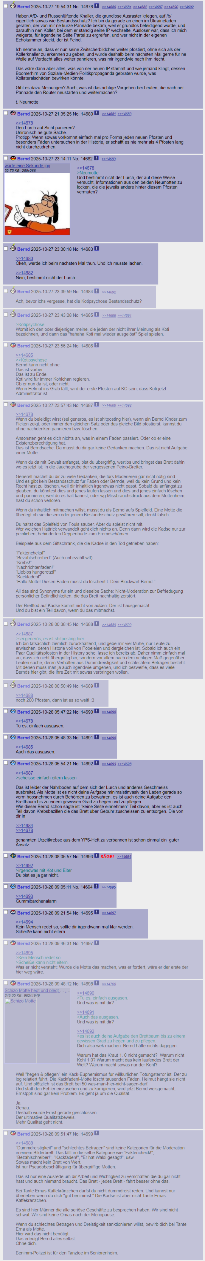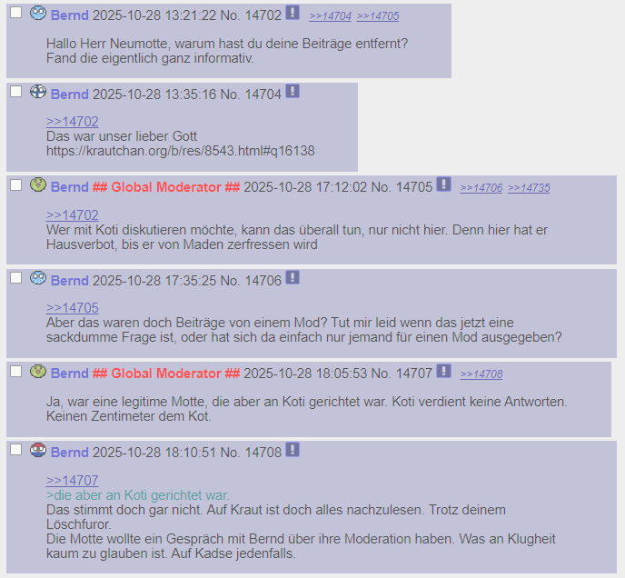 ... hat folgende Theorie zur momentanen Apokohlypse. Exkrementlancierer und Schizomotte machen insgeheim gemeinsame Sache und die Schizomotte ist die Störermotte. Exkrementlancierer bzw. die bots, die für ihn pfostieren, erstellt so viele Fäden wie es geht, mit einzelnem Bild und höchstens drei Sätzen etc., eben die generischste Art, wie Bernd Fäden eröffnet - eben so, dass es gerechtfertigt scheint, jeden stinknormalen Faden zu bannieren. Wozu? Um möglichst viel "Kollateralschaden" an Bernds zu bannieren, damit das Brett stirbt. Man tut so, als wäre es ein Krieg zwischen Exkrementlancierer und der Motte, in Wirklichkeit sind es Exkrementlancierer und Motte gegen Bernd, Helmut denkt die Motte macht gute Arbeit weil er ja "konsequent" gegen Exkrementlancierer vorgeht, Exkrementlancierer umgeht derweil natürlich 100 mal pro Tag seine Bannierung. Seine Fäden werden nicht gelöscht, keine autosäge, soll weitere Bernds dazu bringen, in diesen Fäden Kritik an der Motte auszuüben, damit diese ebenfalls banniert werden. Würde die Motte ernsthaft gegen Exkrementlancierer vorgehen wollen, würde seine scheiße konsequent gelöscht werden und wenn er dann Heulifäden aufmacht ob der Löschung weiss man wenigstens, dass er es ist. So wird aber nicht gehandelt. Es wird alles so runter gespielt, dass maximal viele Bernde banniert werden. Und wenn /b/ dann tot ist, ist /int/ als nächstes dran und dann kommt Krautchan. Krautchan muss tierisch aufpassen, wer hier moderiert und am besten harte, unbequeme Spielregeln für die Motten aufstellen. Wer OPs bannt, muss die Fäden löschen statt sich in dem Faden mit OP zu streiten, weil der Bann sofort umgangen ist. Ich hoffe wirklich, dass die Administration hier ausreichend Ficks gibt und versucht, aus den Fehlern der Vorgänger zu lernen.