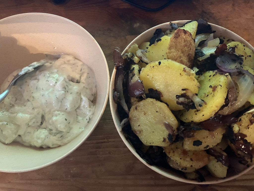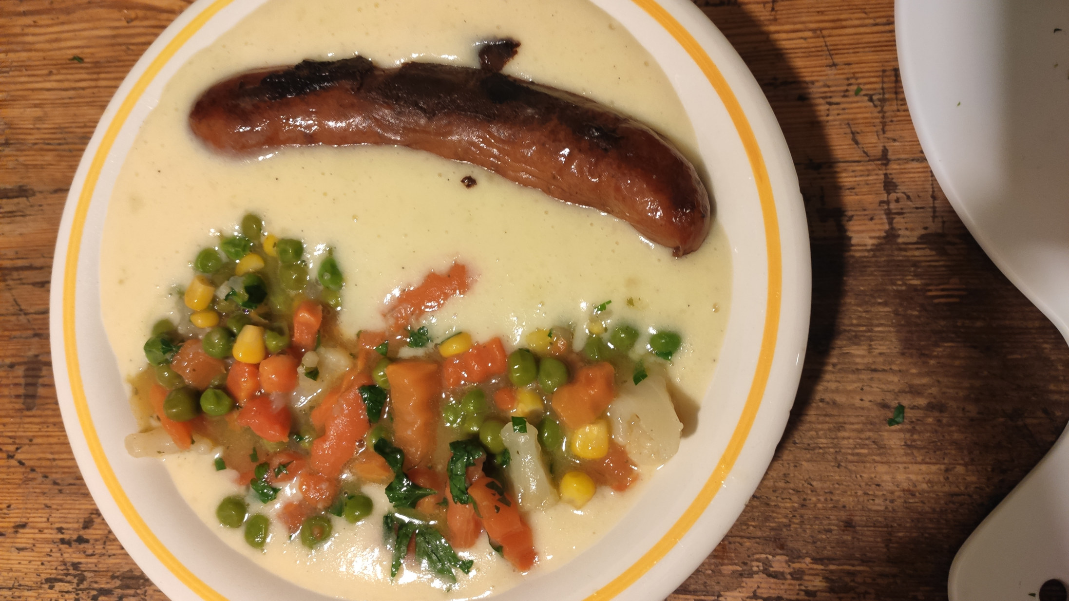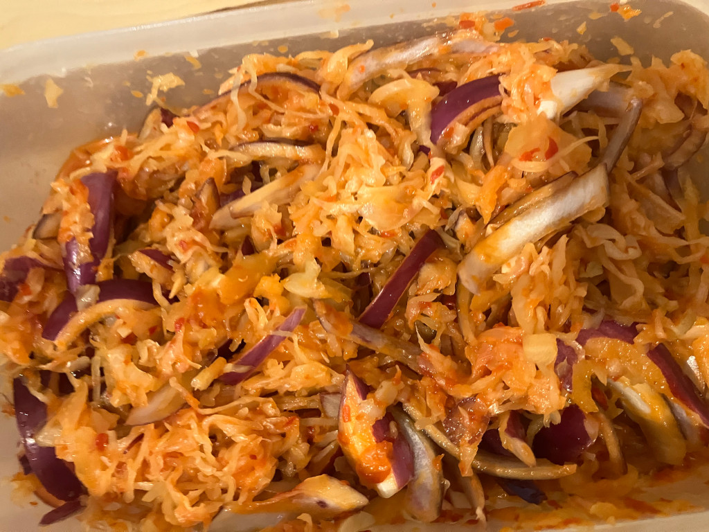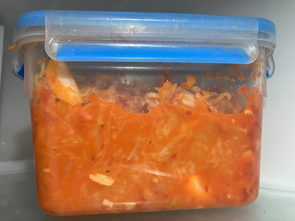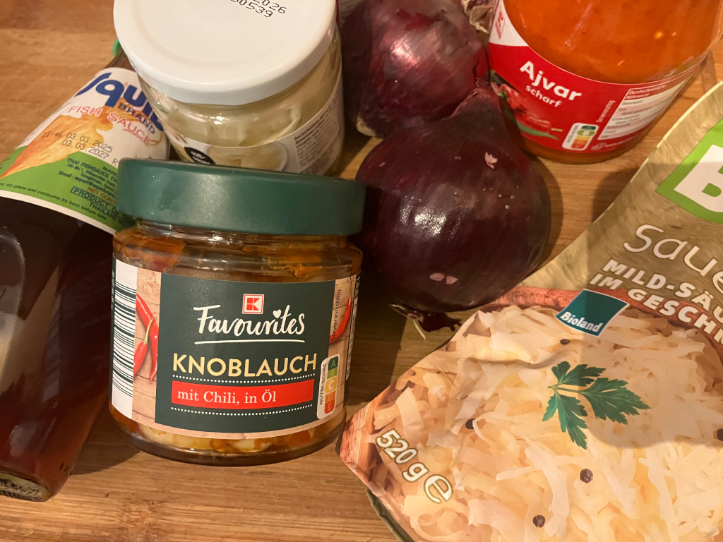 Zeit für Experimente: Da Bernd für seinen Kimchi-Bedarf immer noch keine zufriedenstellende Lösung gefunden hat (selbst machen aufwendig, bestellen doof, kaufen teuer), probiert er heute die deutsche Variante auf Sauerkrautbasis. Kimchi ist in der Regel fermentierter Chinakohl mit Sachen drin, und Sauerkraut ist fermentierter Weißkohl, fehlen also nur die Sachen drin. Bernd probiert es heute mit zwei kleinen Zwiebeln, Knoblauch, zwei Esslöffeln scharfem Ajvar, etwas Salz und einer Prise Zucker, die Zutaten hat er so ähnlich im Zwischennetz gesehen. Leider hat Bernd nur halbherzig für dieses Experiment eingekauft, ansonsten hätte er noch Kimchi-Dinge wie Ingwer oder Chilipulver kaufen können. Der scharfe Ajvar sollte das fehlende Chilipulver aber kompensieren können. Überhaupt macht Bernd sich Sorgen, dass das zu hartkern sein könnte mit den rohen Zwiebeln drin. Eigentlich wollte er die anbraten, aber Rezept sagt roh, also roh es ist. Sollte es wirklich zu scharf sein, könnte man das für die Zukunft mit normalem statt scharfem Ajvar regulieren.