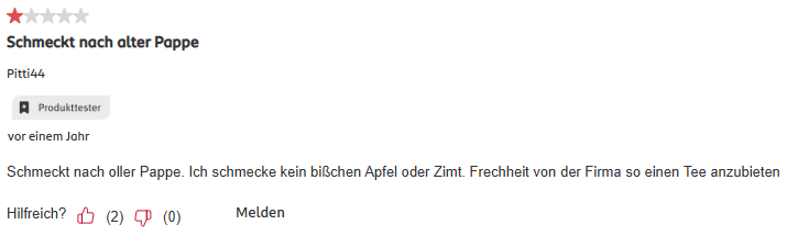 Bernds hat sich gestern Bild relatiert geholt und probiert. Schmeckt recht dünn, vielleicht hat Bernd zu wenig davon genommen. Sollte etwas mehr als ein Teelöffel für eine 0,33l-Tasse gewesen sein, aber das sind auch ziemlich grobe Brocken. >>473 >Meine Mutter hatte einen GG (Gschwendner-Gutschein) im Wert von 20 €. Was hat sie sich gekauft? Eine Tasse mit Bootsmotiv Lachte! Nächstes Jahr gibts dann wohl doch wieder Merci-Pralinen oder Ähnliches als Geschenk.