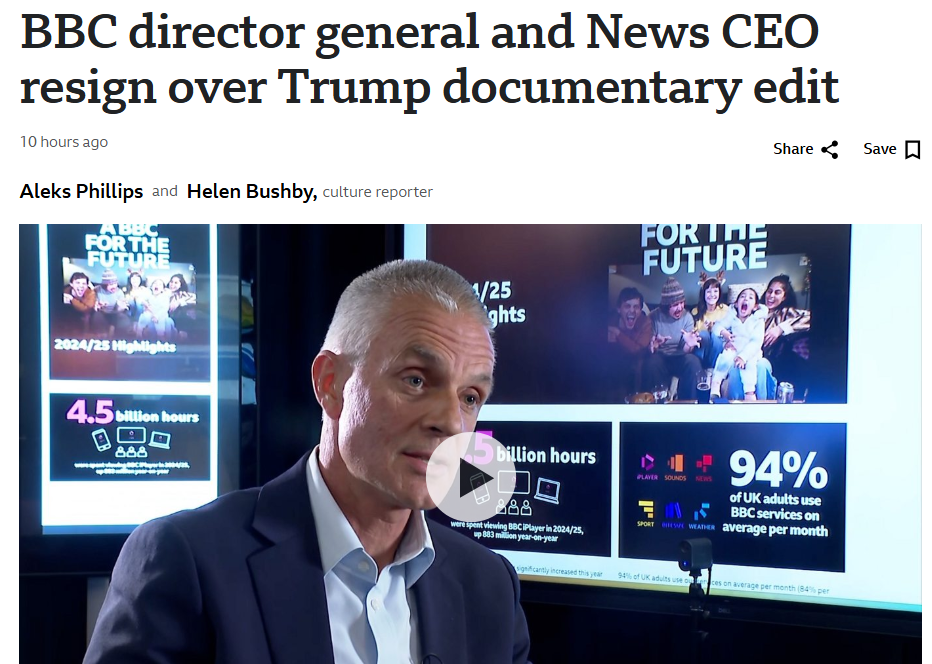 >In Trump's speech in Washington DC on 6 January 2021, he said: "We're going to walk down to the Capitol, and we're going to cheer on our brave senators and congressmen and women." >However, in the Panorama edit he was shown saying: "We're going to walk down to the Capitol... and I'll be there with you. And we fight. We fight like hell." >The two sections that were stitched together were originally more than 50 minutes apart. the BBC vid was published in 2021 in plain view of the whole world, and they are resigning just now - it took bloody 5 years to reason that the guys were lying.