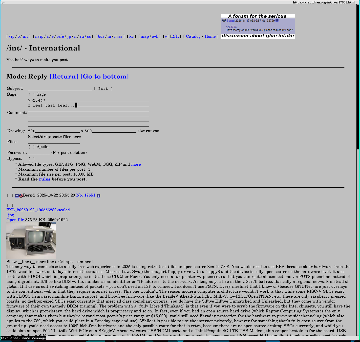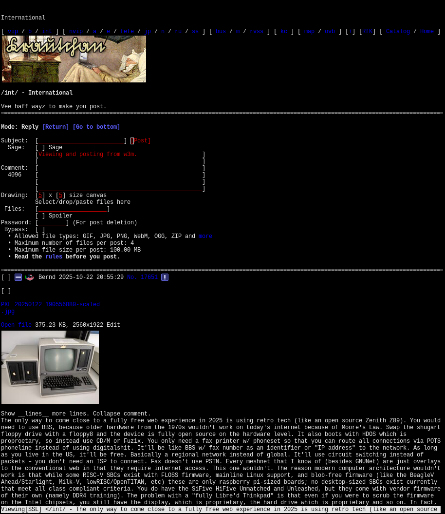 The reason modern computer architecture wouldn't work is that while some RISC-V SBCs exist with FLOSS firmware, mainline Linux support, and blob-free firmware (like the BeagleV Ahead/Starlight, Milk-V, lowRISC/OpenTITAN, etc) these are only raspberry pi-sized boards; no desktop-sized SBCs exist currently that meet all class compliant criteria. You do have the SiFive HiFive Unmatched and Unleashed, but they come with vendor firmware of their own (namely DDR4 training). The problem with a "fully Libre'd Thinkpad" is that even if you were to scrub the firmware on the Intel chipsets, you still have the display, which is proprietary, the hard drive which is proprietary and so on. In fact, even if you had an open source hard drive (which Raptor Computing Systems is the only company that makes yhem but they're beyond most people's price range at $15,000), you'd still need Faraday protection for the hardware to prevent sidechanneling (which also applies to the Z89, which you could place in a Faraday cage and use). While it is possible to use the internet privately, however for something that's fully open source from the ground up, you'd need access to 100% blob-free hardware and the only possible route for that is retro, because there are no open source desktop SBCs currently, and whild you could slap an open 802.11 ath9k Wifi PCIe on a BEagleV Ahead w/ extra USB/HDMI ports and a ThinkPenguin 4G LTE USB Modem, thin copper heatsinks for the board, USB camera/audio, a SIM reader w/ a sysmoUSIM programmed with PySIM and Gentoo running on a resistive open source USN-based HID-compliant touch controller used for rpis (like a XPT2046) however it would be an overcomplicated setup.