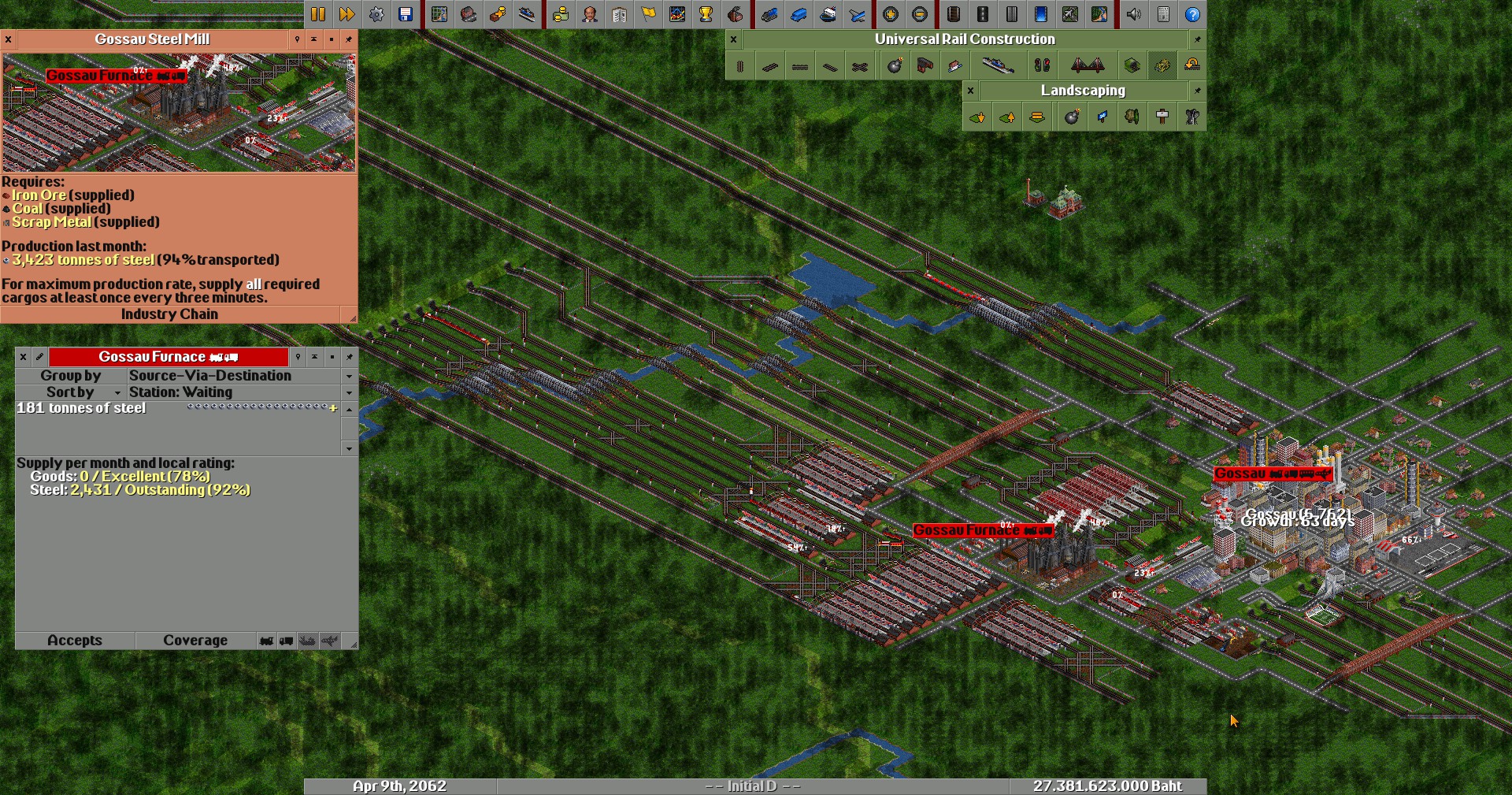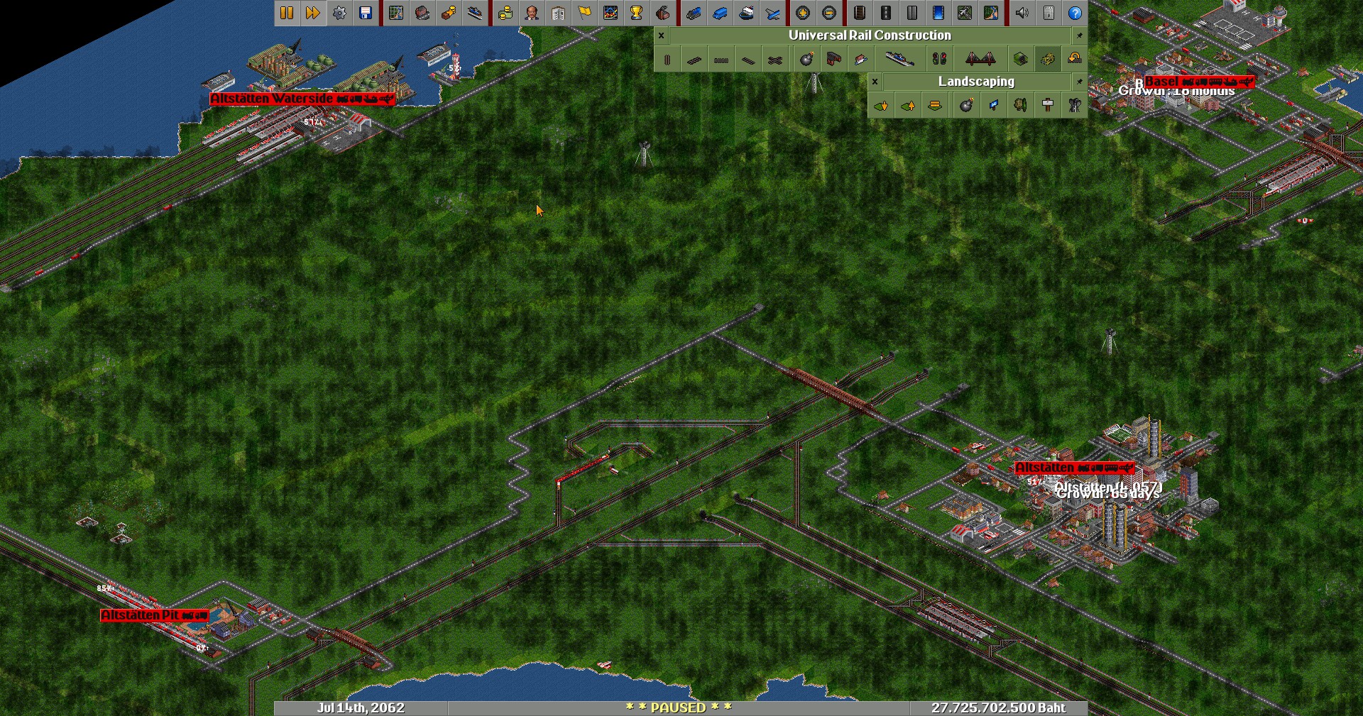 Finally able to post moar OpenTTD! Continued growth in Gössau made a micro line delivering scrap necessary, as truck just won't cut it anymore. Two lanes for a future addition even. Then the steel line got some more love. Did the needful deed and cut the lines at the tunnels to dig into their middle to be able to add signalling there, further reducing this bottleneck in bandwidth. Loading stations got some upgrades as well, some more singular interfaces, a priority exit lane from behind and 6 whole lanes after the tunnels, can't split them here as nicely. While at it the whole line is now 4 lanes too. But we are now delivering nearly all steel with some minor room for improvement and I see a new metalworks being build just nearby Gössau in an undeveloped direction... the good people of Gössau yearn for more lanes! Also look at Altstätten hitting 4k resident. It started out as a 200 souls village that I haven't even deemed necessary to connect to the main line while running by, now it's the worlds capital in plane crashes due to too much traffic into a too small airport! Just imagine how happy those 3.8k people are, now being able to live in this dreamy, far off alpine getaway.