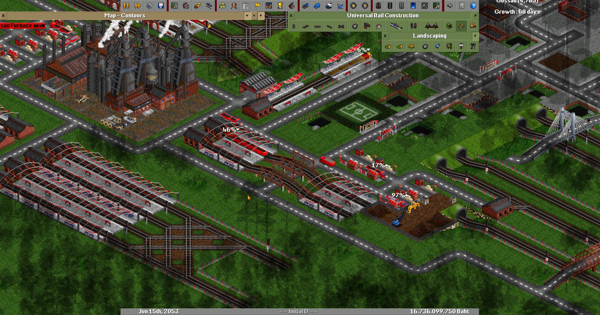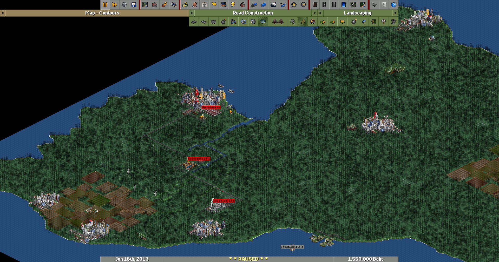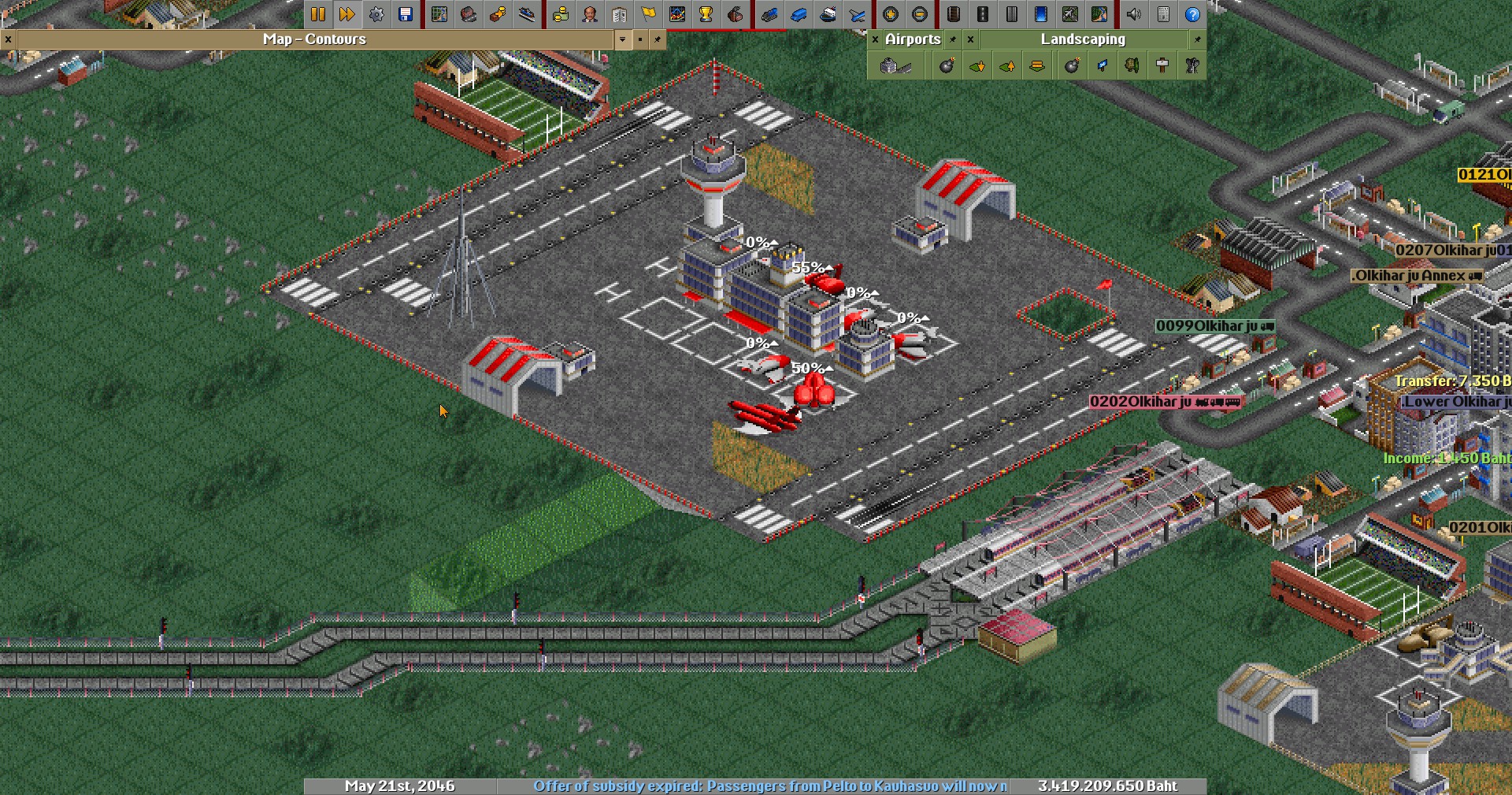 Plopped down an airport in every city and hooked up a ton of roads and intercity connections. There's a a regional line for every city and most are connected by a long range mail and bus lines as well. Some more industry within the bountiful woods behind Tottori getting conquered by steel and fire, diamonds to Sakai and some initial close lumber for the mill there, a shit ton of trains will probably deliver logs here in the future. Ironically all those millions spend spurred simply so much and juicily thick GROWTH, that all cities upgrading simultaneously collapsed populations which cut sharply into profits that I had to cheat in 500 more million to let it slooowly grind in on its own. If you would please consult the chart, it's nicely visible how operating profits slowly trend upwards again as cities expand and provide more passengers for all those new lines. The first bump upwards was when I shortly unpaused after the first 100 million Baht or 2 million in standard currency got spend on infrastructure. Double the amount was poured onto those good souls of Neo-Japan afterwards within the blink of an eye, turning them probably crazy and into a short scene of sexual barbarity from euphoria. Stuff for national holidays really. Anyway, this *ähem* one time emergency financial measure has proven its value and effect as the company state continues to provide GROWTH and profits!