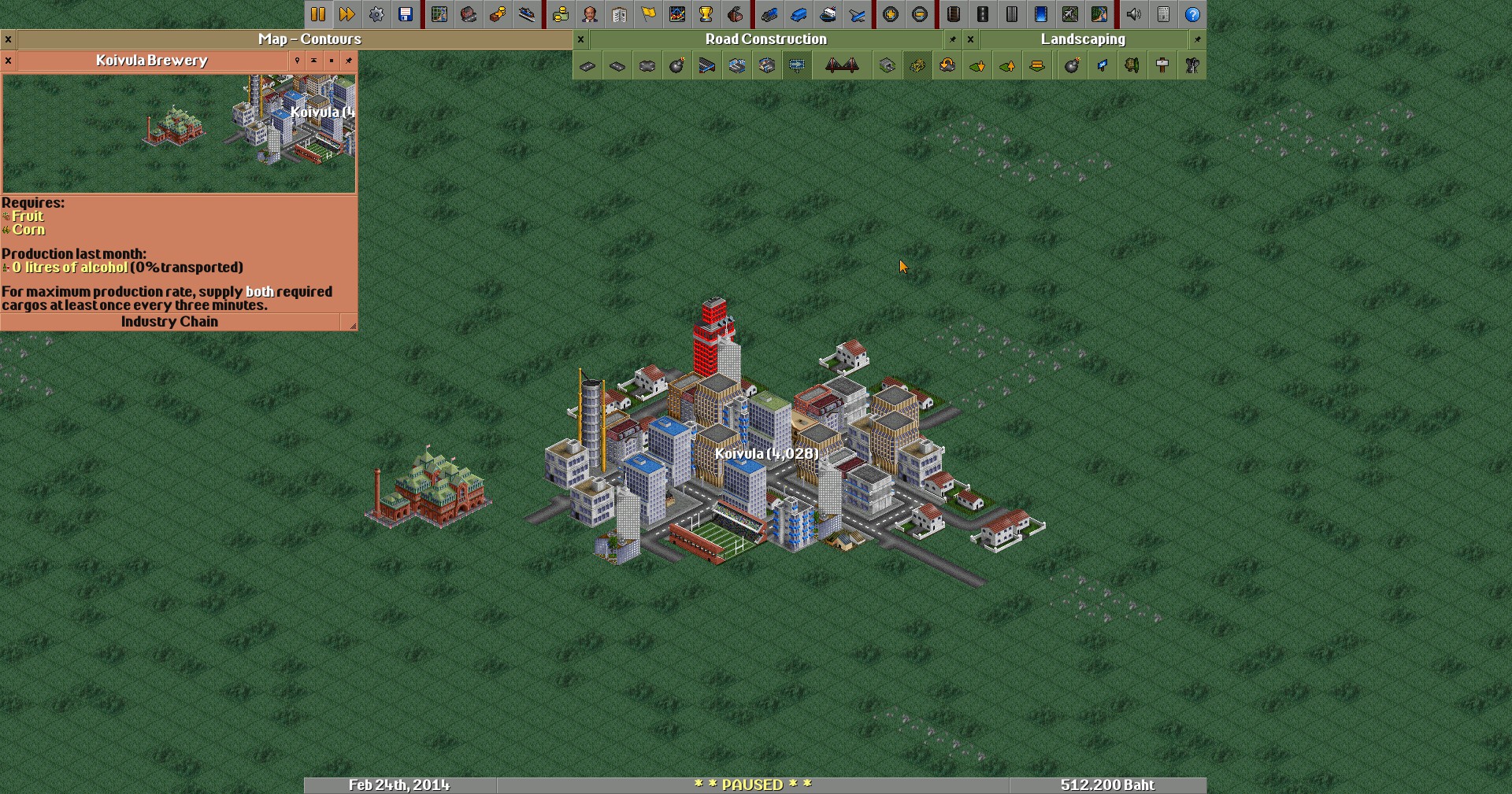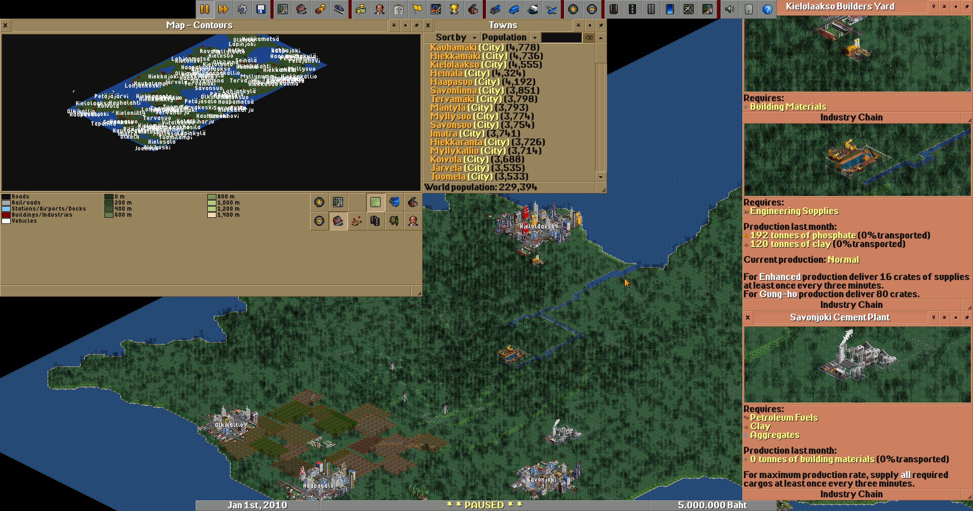 FIRS5 came out of beta a few days ago and I saw that it even offers expanded industry sets. Whatever, let's start a new game with the Hot Land industry and sub-tropic setting using Finnish city names. Tweaked some more settings and made all towns into cities for more growth and larger initial sizes. 1024x512 sized map this time, as I at best filled out a quarter of the old map when it became more interesting and pressing to start upgrading old lines instead of laying new ones. Found a nice coastal town with lots of free space that shall act as starting point. Building materials quickly got set up via trucks making rather little money. But I want to use more trucks this time, as I only used 200 in the last one. They're probably better to spread end products more evenly in smaller portions to consumers regionally. Also to haul in resources from a larger area instead of snaking them off one by one by feeder rail lines. >>16200 That's probably the first time I see an actual interesting Halloween update that actually adds to the game. Most often they are just timed, immersion breaking reskins, bonus points when the devs don't even give an option to turn seasonal stuff off.