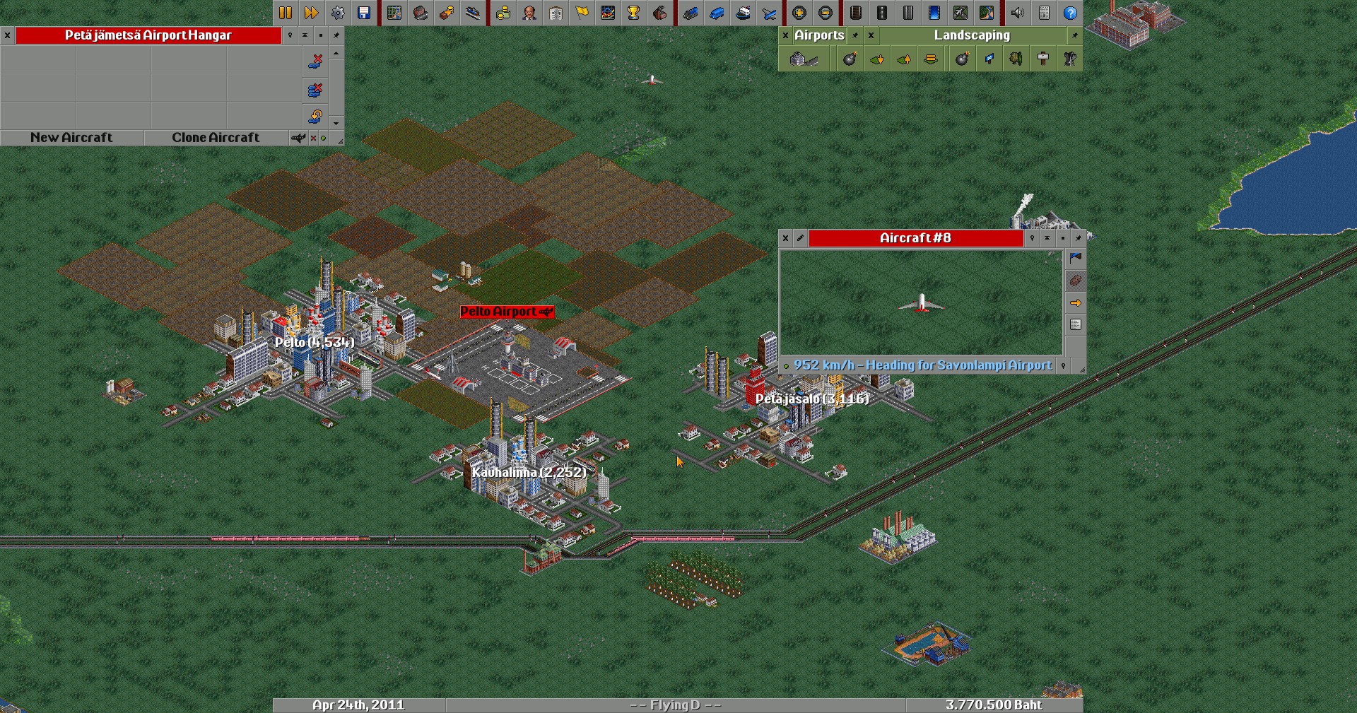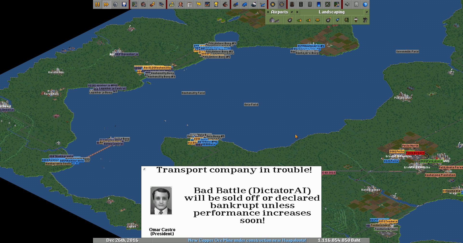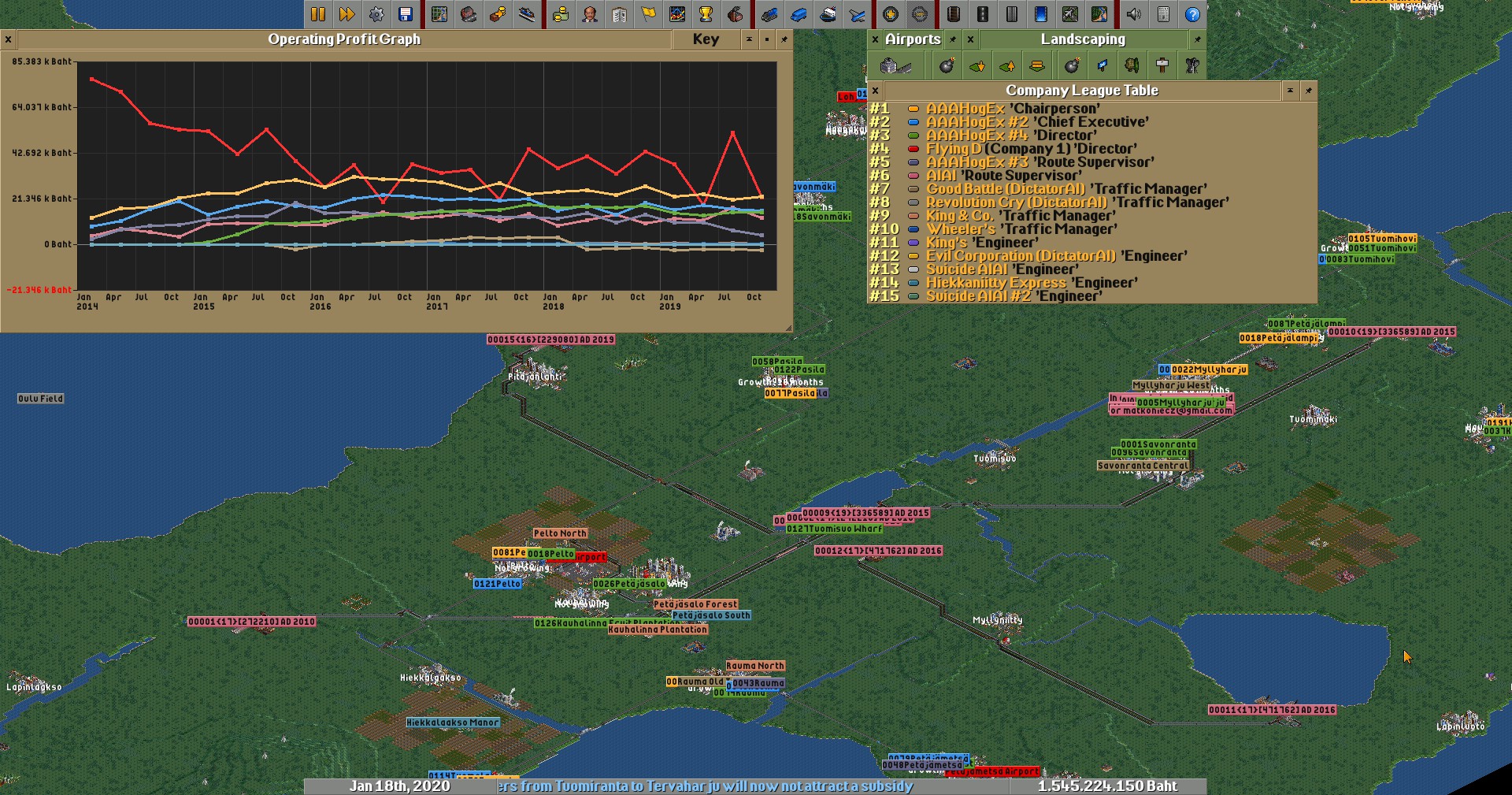 My opportunity detector went off like it hardly ever does with the town of Koivula! There's a nice brewery here and some produce already nearby, just pump it into the city and then spread the bliss of alcohol and growth from there. Thinkgen of some crossing 2 seperate lines that later cojoin to cover more ground. Money generation with that early sole truck setup is rather lame though, despite them shipping a rather profitable chain. Going to hook up a nearby harbor with ships to increase output and a bonus on top. Then I started some kind of AI battle as I was watching something similar on YT in the background. Same settis as the other game, I plopped down some airports and slowly set up 15 planes. Really only the AAAHog could survive, probably due to FIRS5 and it being an overall great AI, pretty much the conclusion of the video as well. Some AIs only spammed the same road stations in the same cities and went bankrupt, slowly piling up more stations. A short lived fun and legit way to play a little more with planes :3 >>16250 Oh, I thought it would be some kind of "unexpected" detour that randomly starts to appear around that time on routes. Thought the challenge to maneuver here is the horror, yet kind of point of the game? Also then it's just a one off for some Halloween skin reward?