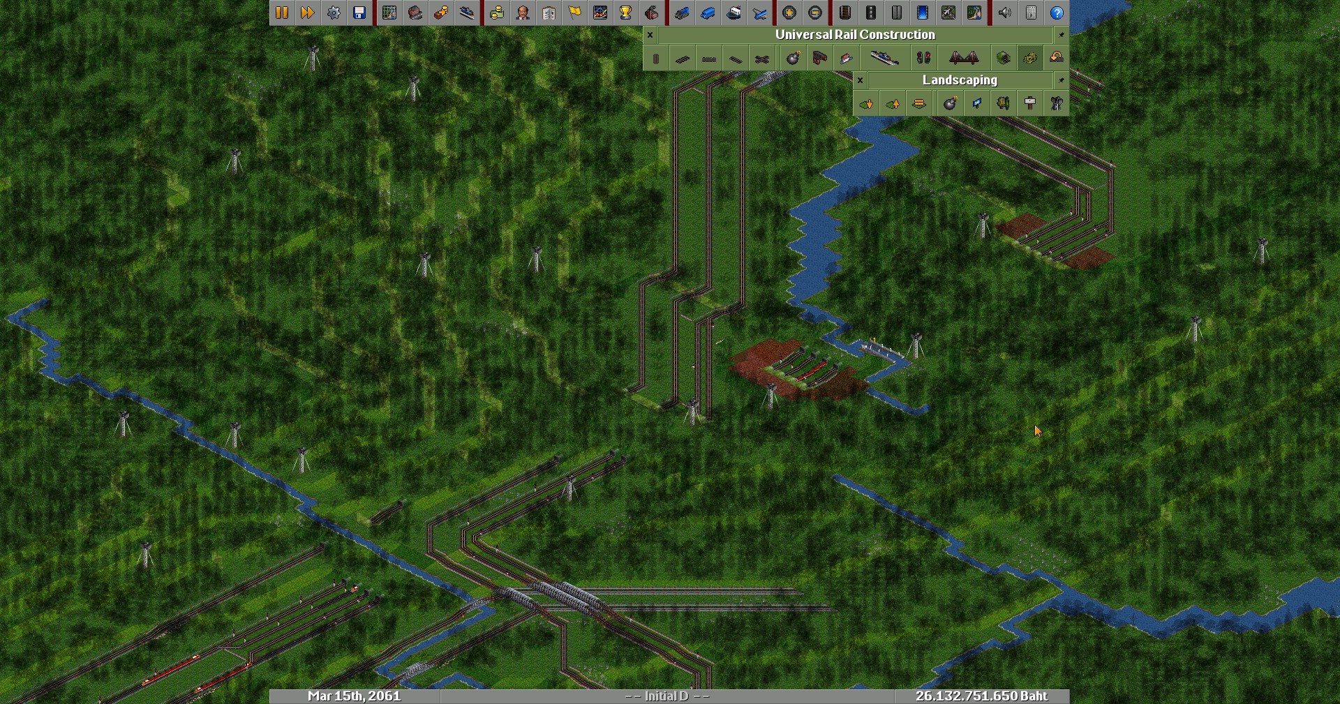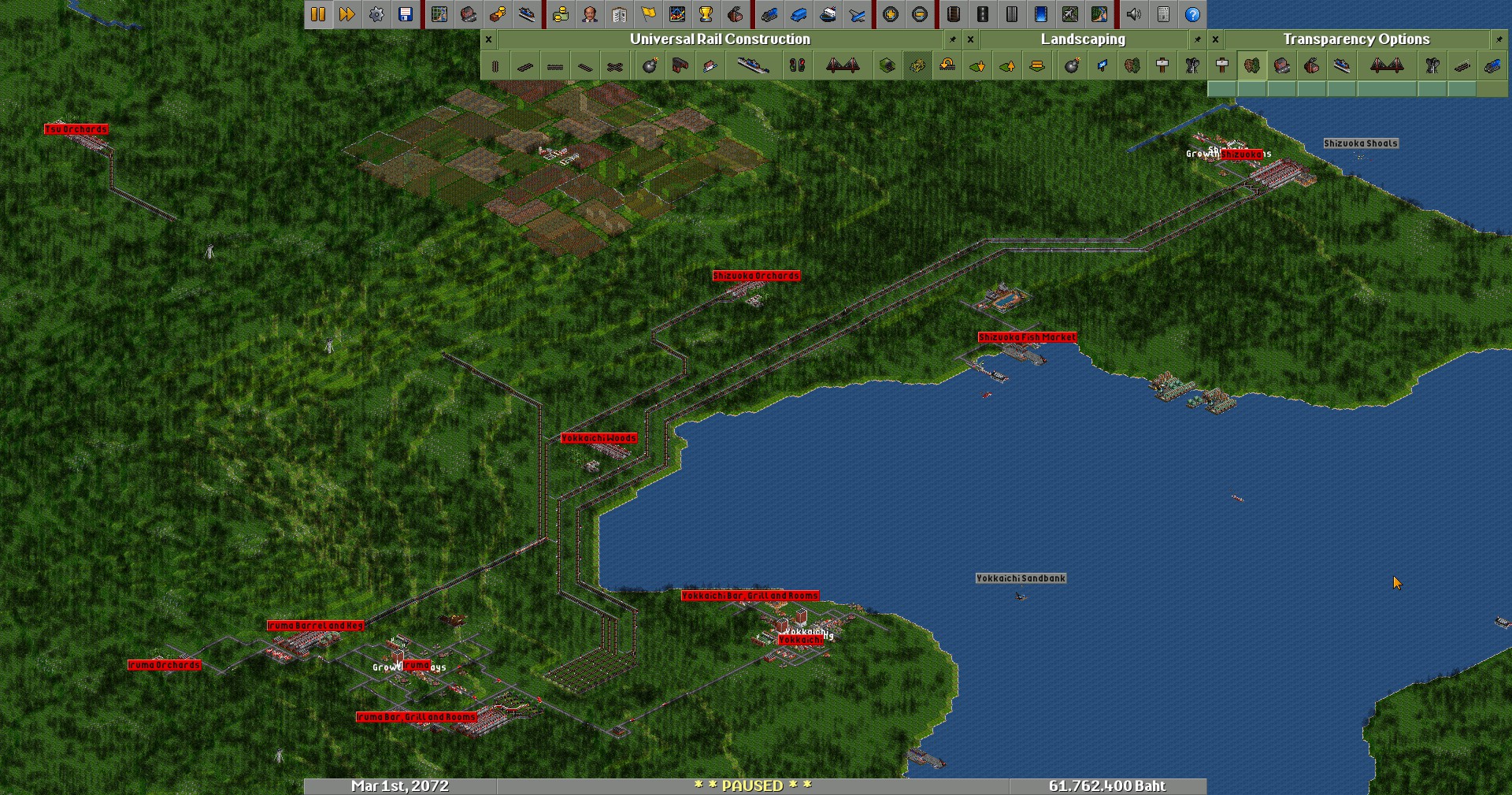 Finally! After restarting so much, every time nudging mods, changing settis and starting out differently, I think I have it, that one round of game I was searching. Very large, nicely generated 1024x1024 map with "just" 50 full fledged cities. The commies may rejoice, I took away the AIs ability to build roads, we have vibe planning engineers to centralize this decision in the name of an efficient and orderly workforce. "Minimal" regular starting industries with the used city script - Renewed Village Growth - layering another "low" layer of raw materials over the map after creation, giving a lot to transport to a few select places. Last map I played, I turned all industry off and had to fund them at at first horrendous rates to have them placed by myself, making transporting them rather arbitrary except for money earned which started to matter less very quickly. So this time I limit myself to only build shops in cities as they tend to take their time with building them on their own. Maybe I also place hotels to generate more passengers myself, but only if they fit nicely. Startup went pretty smooth. Two quick electrics to generate money. Convert everything to universal rail and bless this land with the first junction, which now fluently drops from the heavens upon these lands. LOL and Awww ^_^ at how smol Chiba is, we'll grow the shit out of it later. And a first long range rail to cover some ground and set up feeder lines, still have to find some factories anywhere.