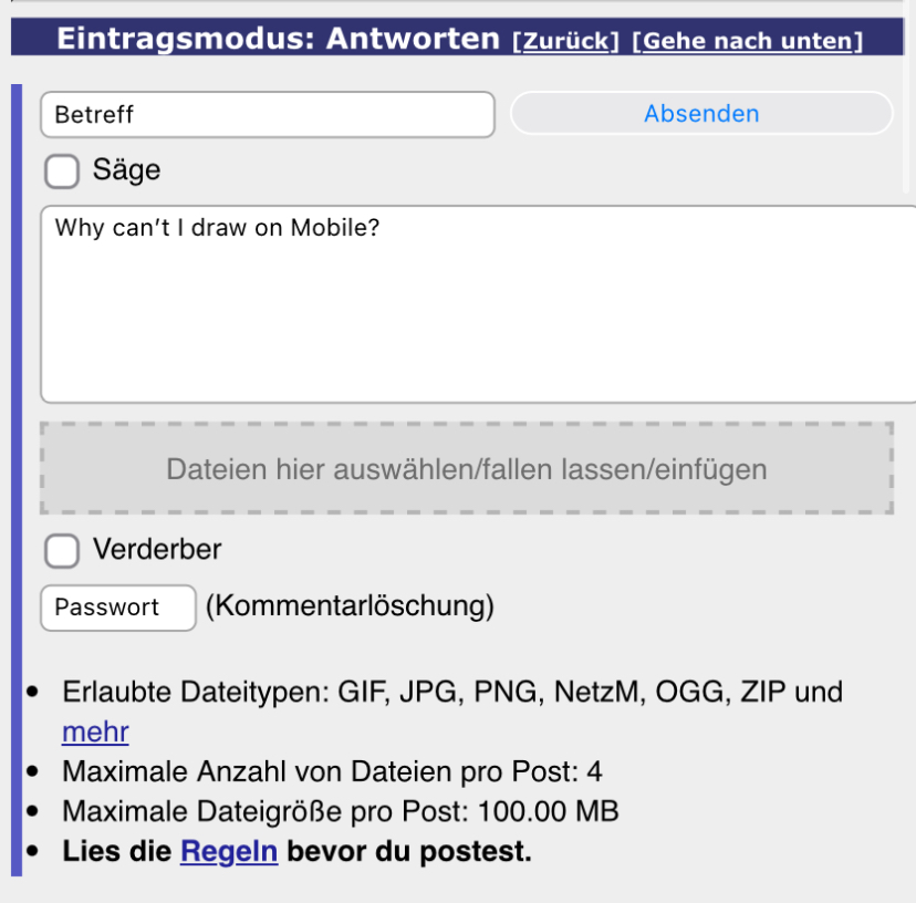 Dies ist der Faden, in dem Bernd sich Features wünschen kann. Ich fange mal an: 1. Bildersuche. Der Vierkanal hat das und es ist eigentlich ziemlich einfach. Per Knopfdruck werden folgende Elfenjungen eingeblendet: > https://lens.google.com/uploadbyurl?url=$BILDURL > https://www.yandex.com/images/search?url=${BILDURL}&rpt=imageview > https://saucenao.com/search.php?url=${BILDURL} 2. Bild bearbeiten. Alt-KC hatte eine Option, die ein Bild in den Shi-Painter geworfen hat, sodass man z.B. Bingos ausfüllen, oder anmerkungen wie "FETT" in Bilder kritzeln konnte. Ein kurzer Blick in die Doku von wPaint sagt mir, dass das auch gehen sollte.