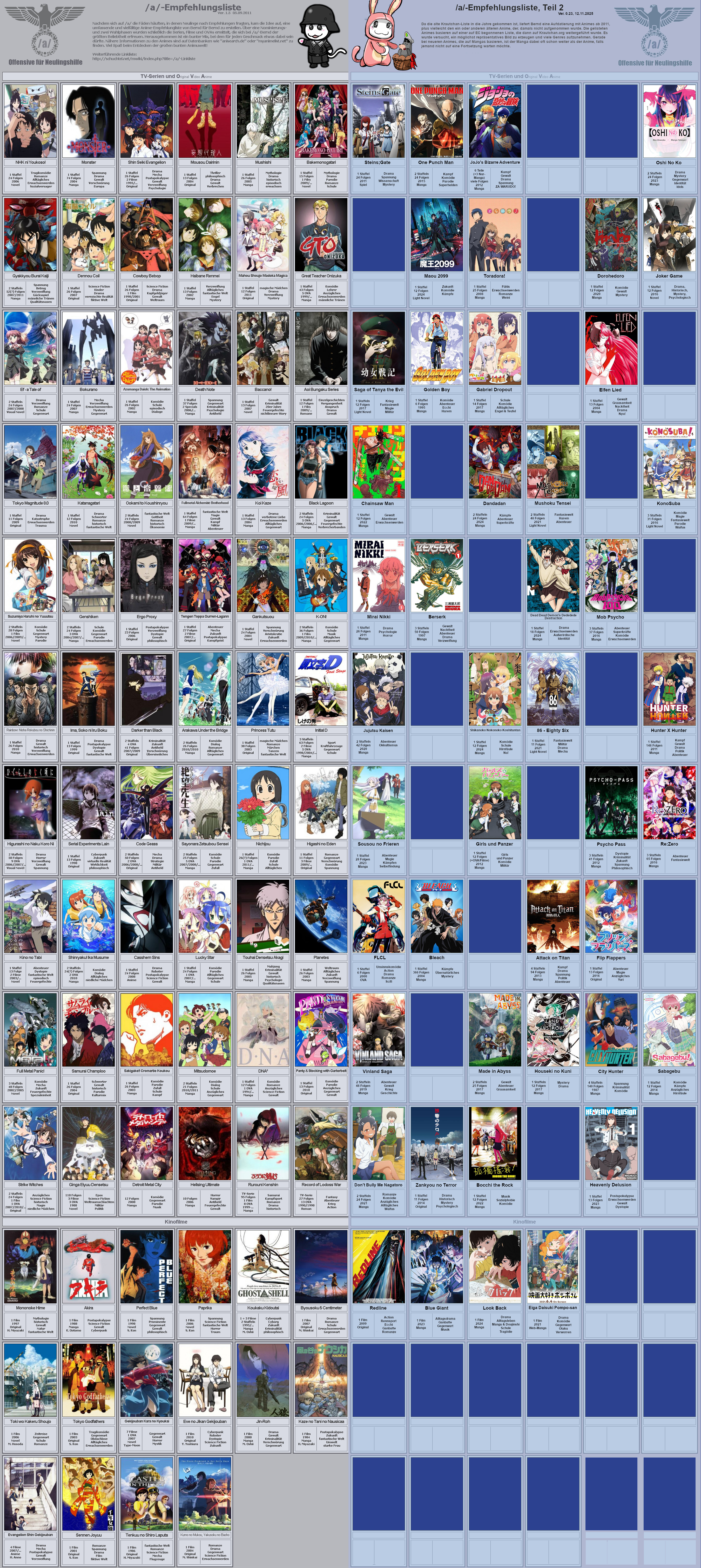 Wie wäre es mit >>415? Nach 10 Folgen ist Bernd durchaus angetan. Und damit wir nicht nur Uralt-Scheiß auf die neue Liste packen: Was ist mit Non Non Biyori? Bernd hat es noch nicht gesehen, ist das tatsächlich gut, oder ist es nur Nyanpasu? >>424 >>429 Bernd hat verstanden, dass 86 und City Hunter auf jeden Fall drauf sollen, und bei Duradura und Blood+ eventuell noch Diskussionsbedarf ist? Er kümmert sich die Tage um die neuen Einträge. Hier mal eine aufdatierte Liste, was schon alles drauf ist. Alte Liste Anime: NHK, Monster, Neon Genesis Evangelion, Mousou Dairinin, Mushishi, Bakemonogatari, Gyakkyou Buraj Kaiji, Dennou Coil, Cowboy Bebop, Haibane Renmei, Madoka Magica, Great Teacher Onizuka, Ef - A Tale Of, Bokurano, Azumanga Daioh, Death Note, Baccano, Aoi Bungaku Series, Tokyo Magnitude 8.0, Katanagatari, Ookami to Koushinryou, Fullmetal Alchemist Brotherhood, Koi Kaze, Black Lagoon, Suzumiya Haruhi No Yuuutsu, Genshiken, Ergo Proxy, Tengen Toppa Gurren Lagann, Gankutsuou, K-ON, Rainbow Nisha Rokubou no Shichinin, Ima Soko Ni Iru Boku, Darker Than Black, Arakawa Under the Bridge, Princess Tutu, Initial D, Hirugashi No Nako Koro Ni, Serial Experiments Lain, Code Geass, Sayonara Zetsubou Sensei, Nichijou, Higashi No Eden, Kino No Tabi, Shinryaku! Ika Musume, Casshern Sins, Lucky Star, Touhai Densetsu Akagi, Planetes, Full Metal Panic, Samurai Champloo, Sakigae! Cromartie Koukou, Mitsudomoe, DNA, Panty&Stocking with Garterbelt, Strike Witches, Ginga Eiyuu Densetsu, Detroit Metal City, Hellsing Ultimate, Rurouni Kenshin, Record of Lodoss War Alte Liste Filme: Mononoke Hime, Akira, Perfect Blue, Paprika, Koukaku Kidoutai Byousoku 5 Centimeter, Toki Wo Kakeru Shoujo, Tokyo Godfathers, Gekijouban Kara No Kyoukai, Eve No Jikan Gekijouban, Jin-Roh, Kaze No Tani No Nausicaa, Evangelion Shin Gekijouban, Sennen Joyuu, Tenkuu No Shiro Laputa, Kumo No Mukou, Yakusoku No Basho Neue Liste: Steins;Gate, One Punch Man, JoJo's Bizarre Adventure, Oshi No Ko, Maou 2099, Toradora!, Dorohedoro, Saga of Tanya the Evil, Gabriel Dropout, Elfen Lied, Chainsaw Man, Mushoku Tensei, KonoSuba, Berserk Dead Dead Demons DeDeDeDe Destruction, Mob Psycho, Shikanoko Nokonoko Koshitantan, Hunter X Hunter, Sousou No Frieren, Girls und Panzer, Psycho Pass, Attack on Titan, Vinland Saga, Made in Abyss, Sabagebu, Don't Bully Me Nagatoro, Bocchi the Rock, Heavenly Delusion, Flip Flappers, Mirai Nikki, Jujutsu Kaisen, Re:Zero, Dandadan, Bleach, Houseki no Kuni, Terror in Tokio, Joker Game, Golden Boy, FLCL Neue Liste Filme: Redline