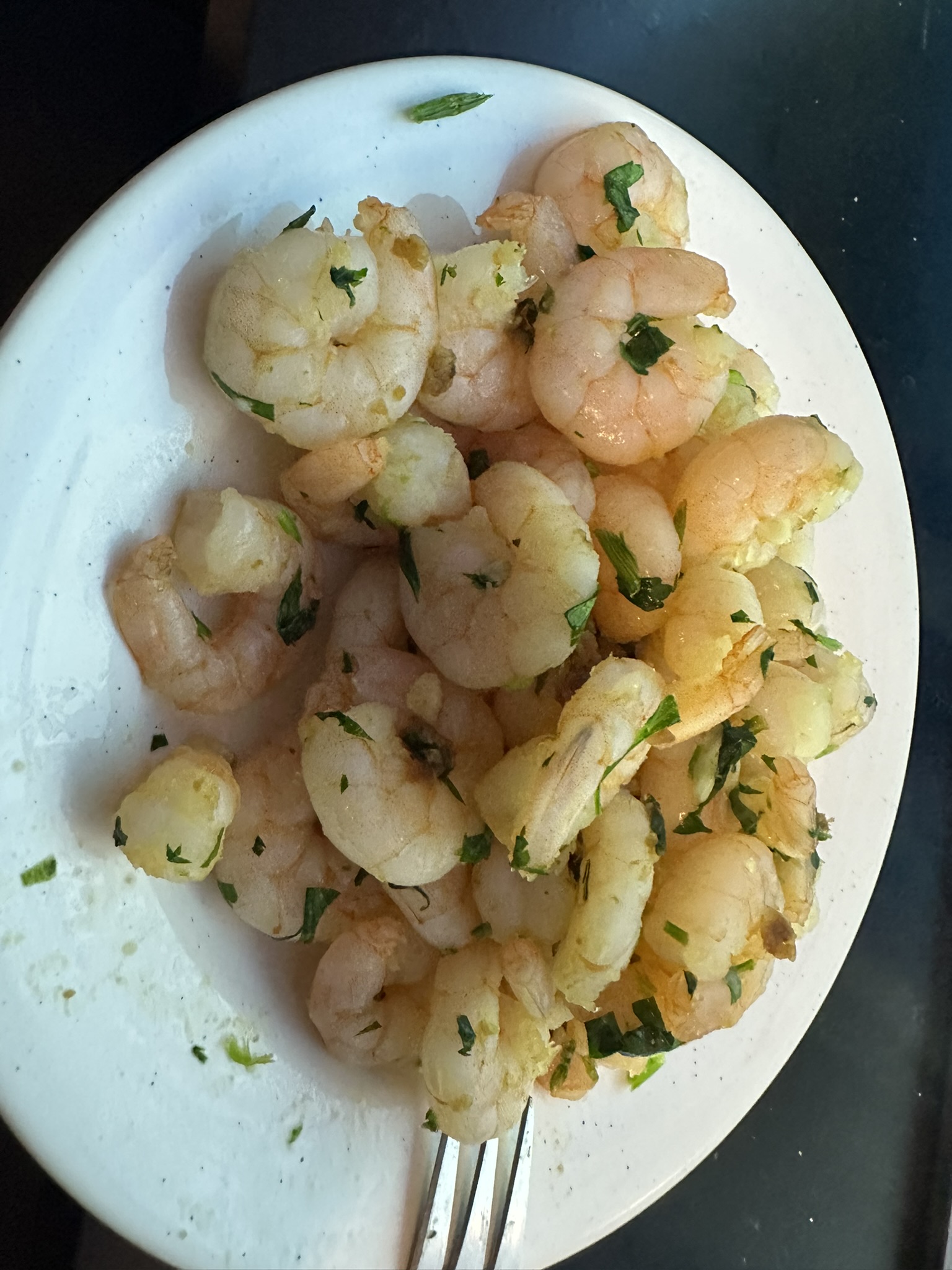 Garnelen mit Knoblauch, Olivenöl und Petersilie.