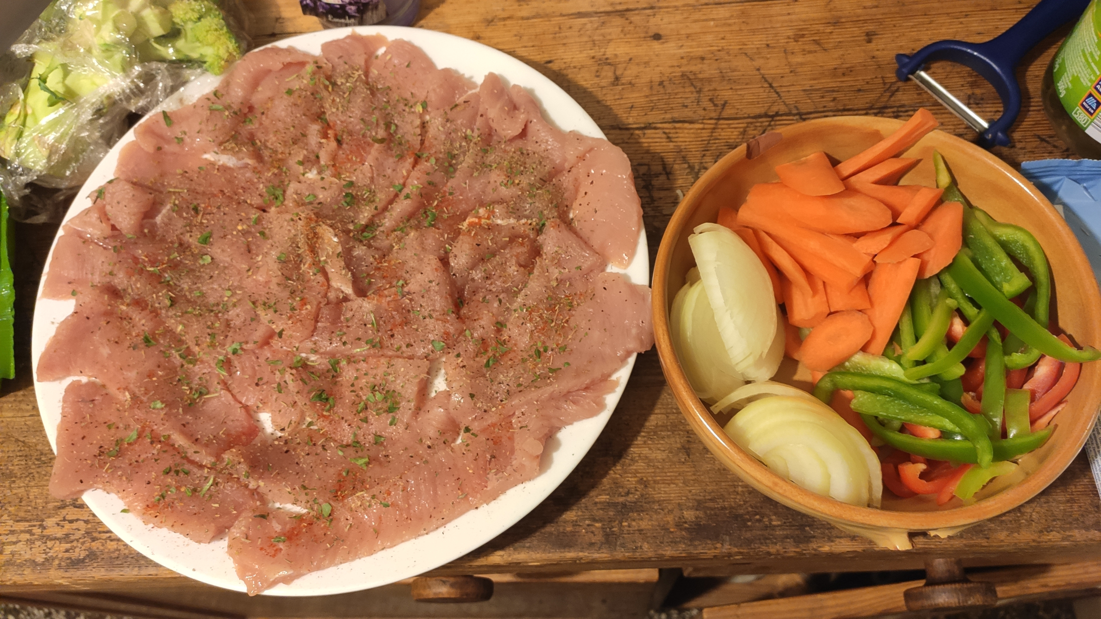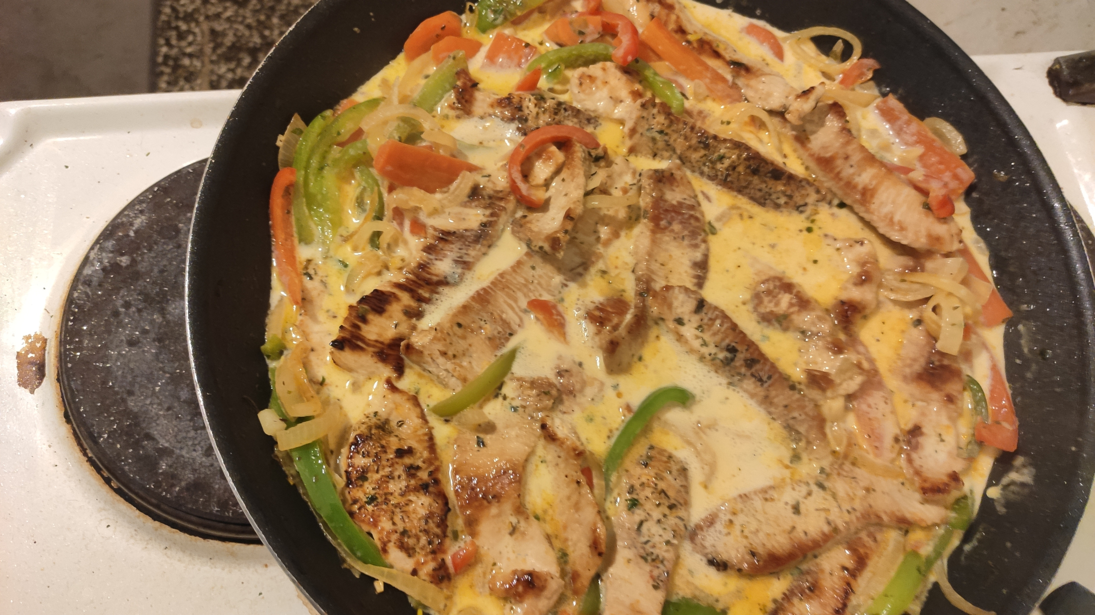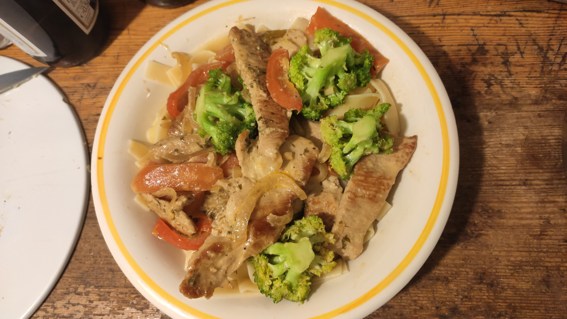 Bernd hat sich mal wieder eine Putenfleischpfanne gemacht, diesmal mit Zwiebel, Paprika, Brokkoli, Karotten, (breit)Bandnudeln und !Schlagobers!
