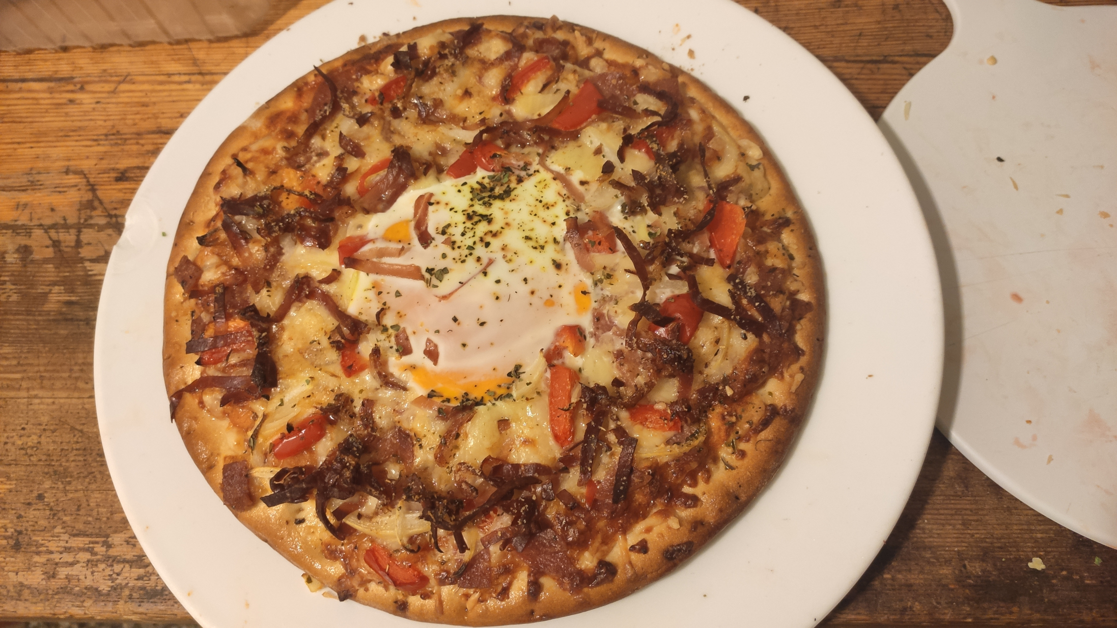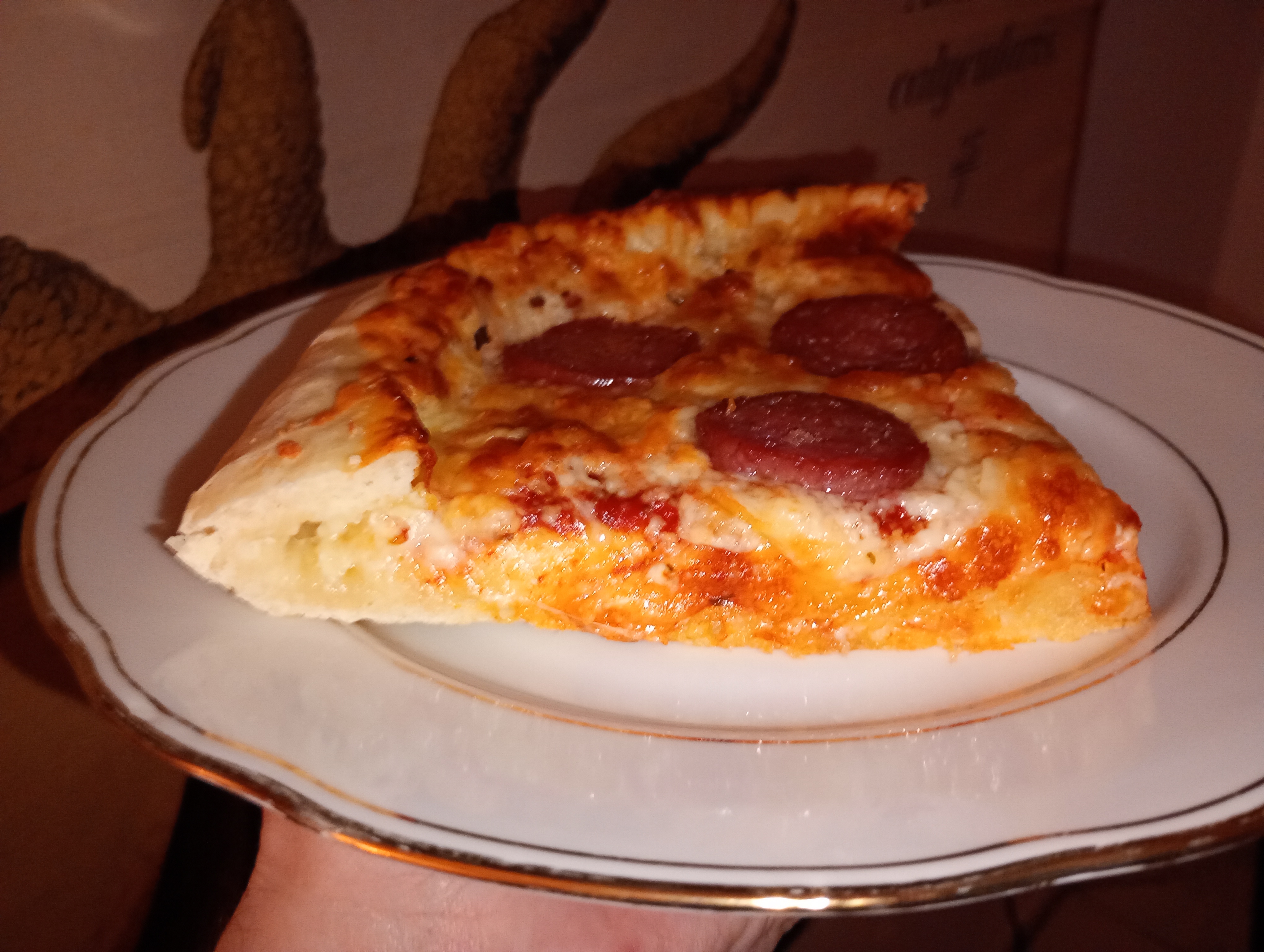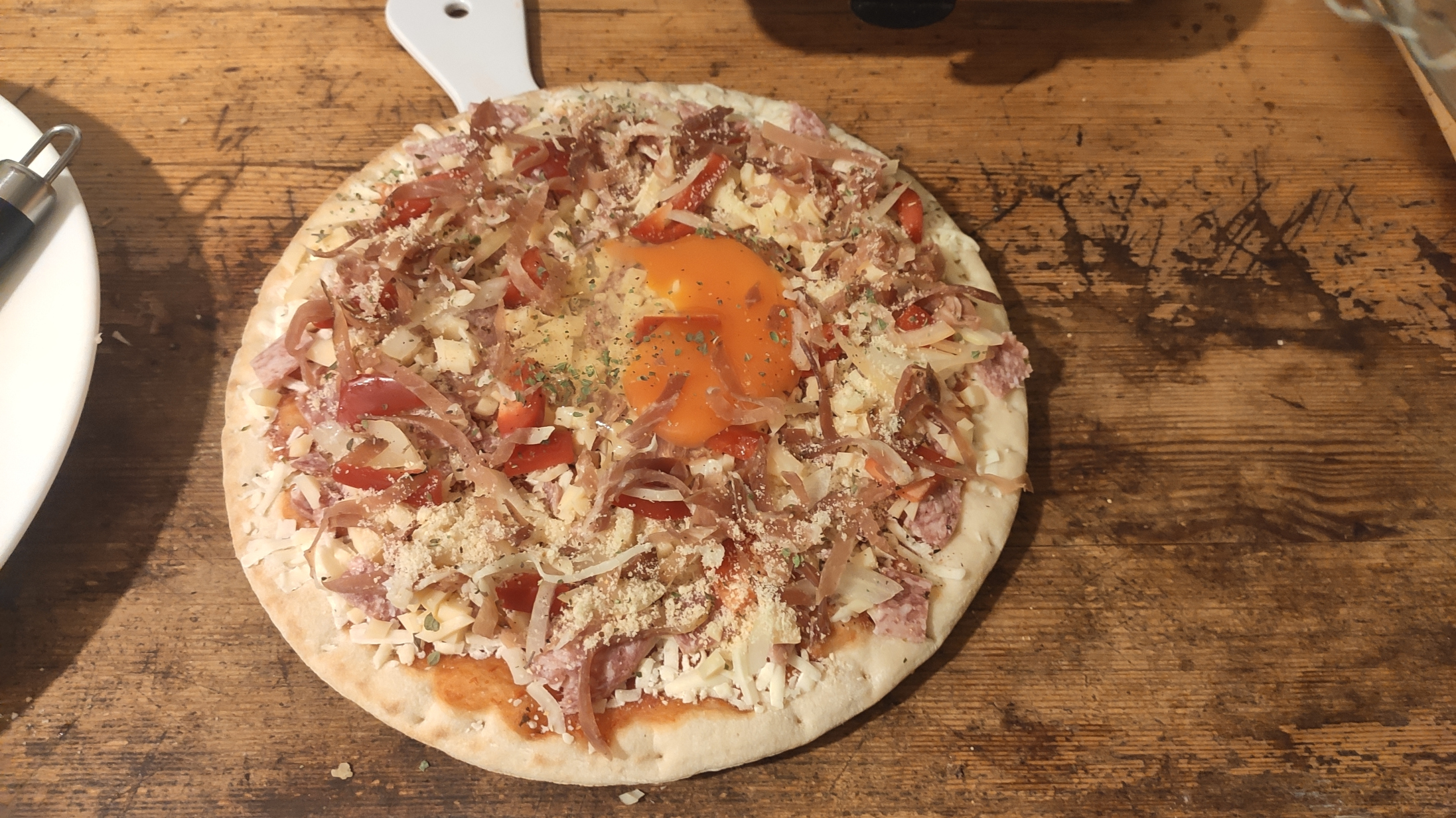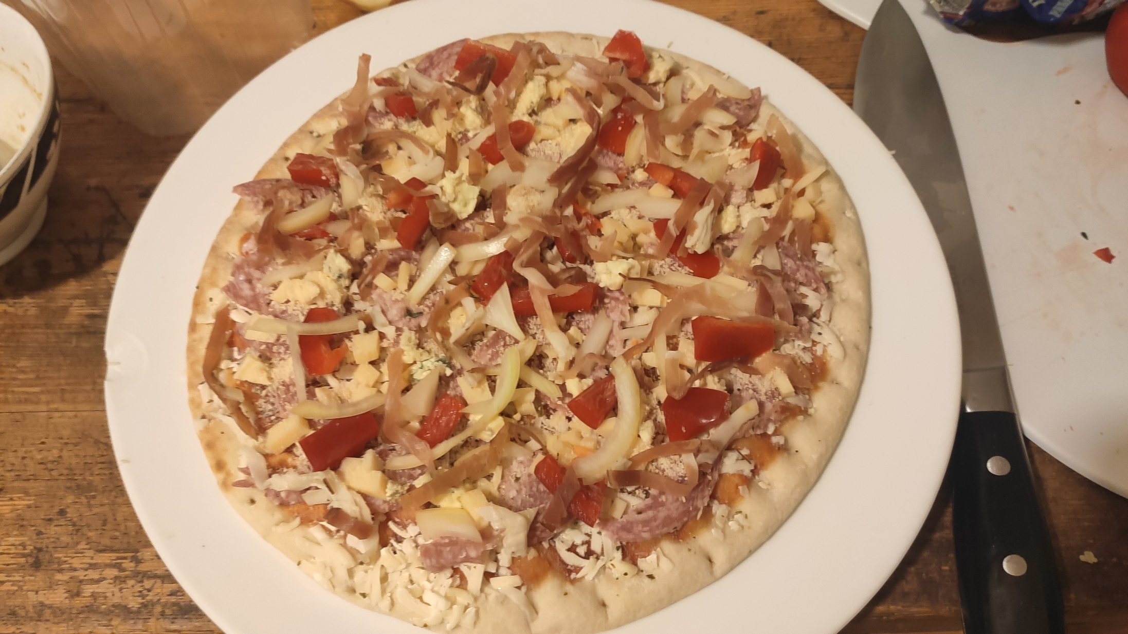 Bei Bernd gabs dieses Wochende selbstgemachte Pizza. Der Teig ist nochmal richtig gut gelungen. Leider war die Salami nicht so geil; war "italienische". In Zukunft nur noch ungarisch oder Chorizo. Bernd versuchte sich außerdem an einer käsegefüllten Kruste, was nur leidlich funktioniert hat.