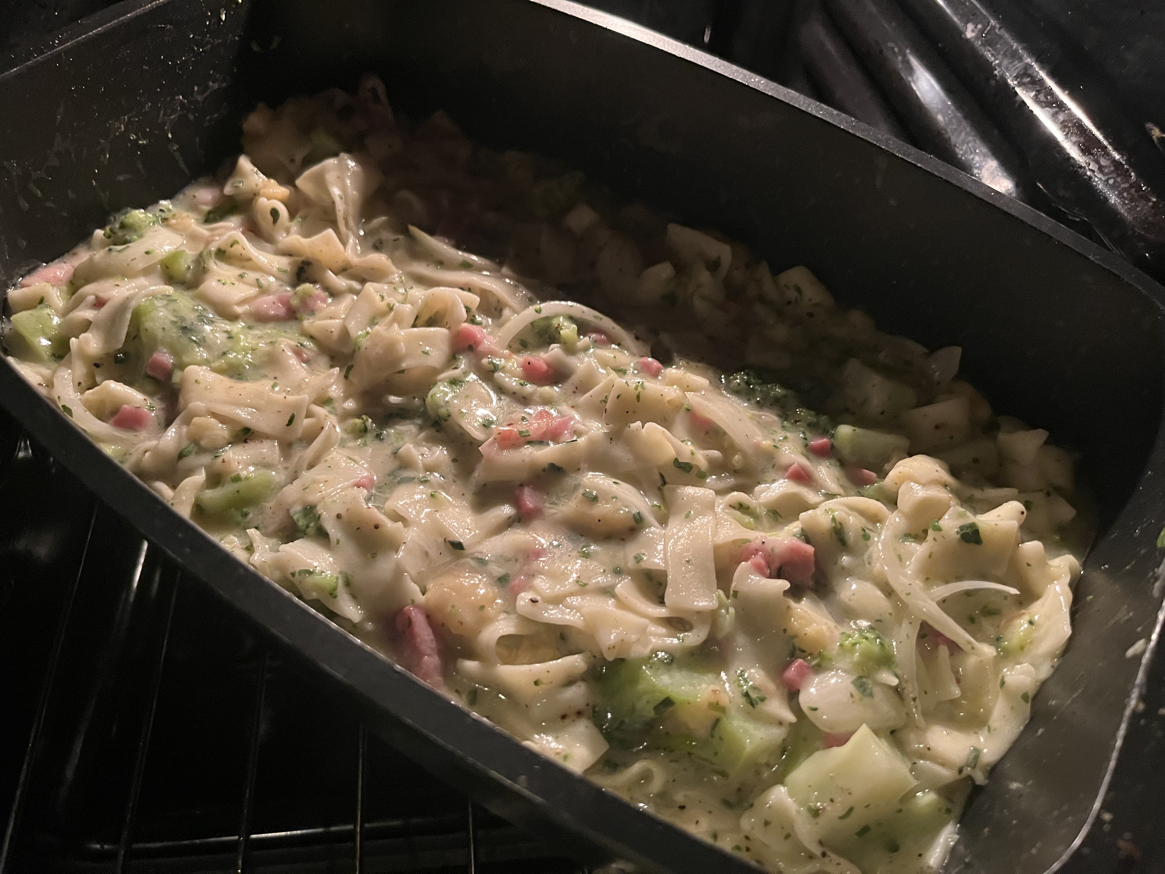Bernd bereitet gerade eine Kalorienbombe vor, von der er wohl die nächsten Tage zehren kann. -300 g Nudeln (vorgekocht) -3 Tüten Sauce Hollandaise, 250 ml à Tüte, dazu noch extra Butter -Ein halber Brokkoli (vorgekocht) -Eine Zwiebel, in Ringe geschnitten -Eine Tüte Streukäse -Zwei Packungen Speckstreifen/Würfel, 100 g à Tüte -Zwei Zehen Knoblauch, kleingeschnitten -Pfeffer, Salz, Petersilie, Schnittlauch Zum Schluss wird Bernd auf Ober-/Unterhitze umstellen und nochmal Streukäse drauf verteilen.