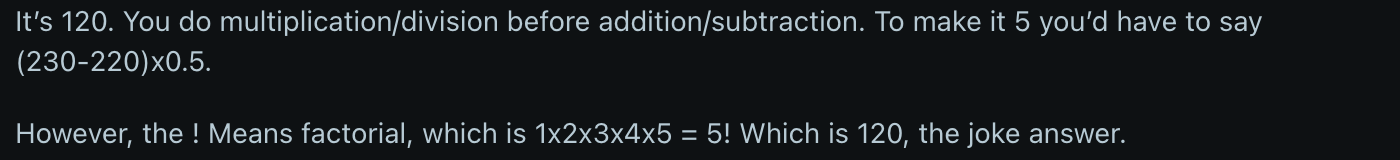Do you think you are good at math! Then solve this: 230 - 220 * 0.5 Believe it or not, but the answer is actually 5!