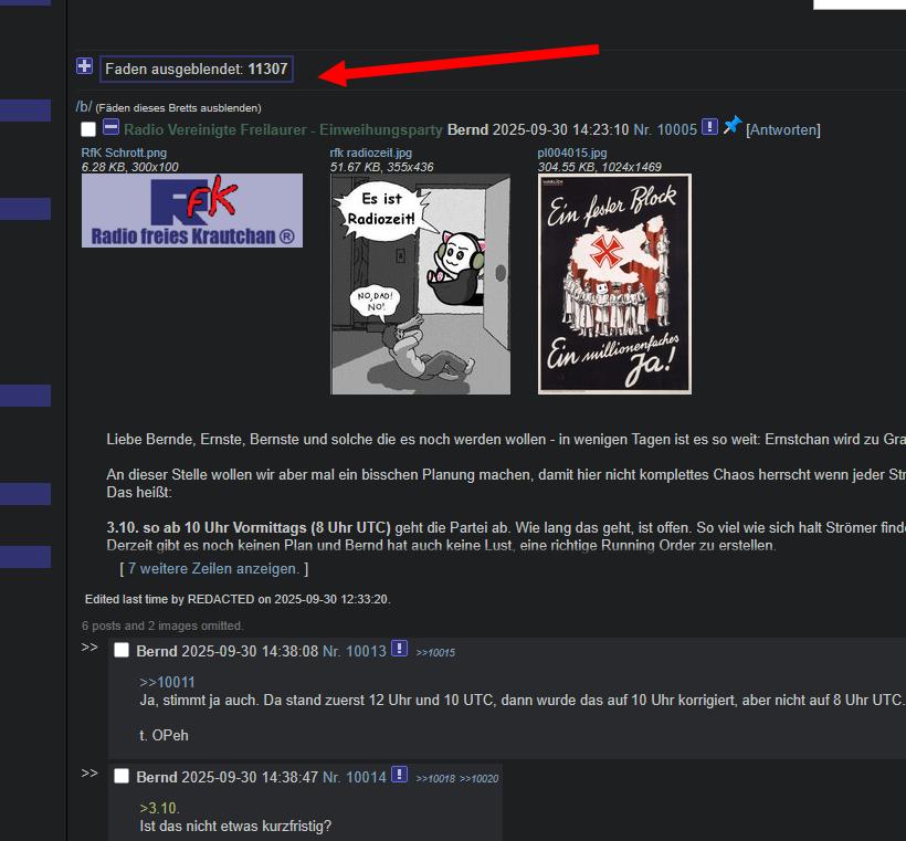 Bezüglich der Abschaltung des ErnstKanals ( https://ernstchan.top/meta/res/1070.html ) haben wir uns in den letzten Tagen mit AdminErnst ausgetauscht und haben über die Möglichkeiten des Weiterbetriebs vom ErnstKanal selber, aber auch der weiteren Diensten gesprochen. Das Brett Bei den Gesprächen zwischen uns und dem Team vom ErnstKanal hat sich herauskristallisiert, dass sich aus unterschiedlichen Gründen der Weiterbetriebes von EC nicht mehr lohnt, da dieser nicht auf eine Weise möglich ist, welche die Kultur des Brettes erhält. Aktuell sind wir noch im Austausch, wie wir bestimmten Aspekten der EC-Kultur hier ein neues zu Hause bieten können, beispielsweise in Unterbrettern. Das Radio (und TV) Wir werden das Radio übernehmen und bei uns weiter betreiben. Hierfür haben wir als Zeitfenster aktuell Ende September geplant. Je nach Umständen kann sich dies jedoch noch nach hinten verschieben. Sobald wir ein genaues Datum für den Eröffnungsström haben, wird es hierzu eine weitere Ankündigung geben, in der es dann auch um Ströminhalte gehen wird. Wir werden die alten Ström-Zugänge von EC übernehmen, so dass zu und nach der Eröffnung die bisherigen Ström-Ernste direkt auflegen können. Details zu "Wie kann ich selber strömen?" und Ähnlichem folgen noch. Die Übernahme des TVs (Videoströms) ist ebenfalls geplant, wird jedoch im Nachgang zum Radio erfolgen. Vorschläge für den (neuen) Namen des Radios, nehmen wir gerne an Drinvor: RfK Die Würfel Übernehmen wir ebenfalls. Wird nach Umsetzung angekündigt. Quake Servierer Fick ja!