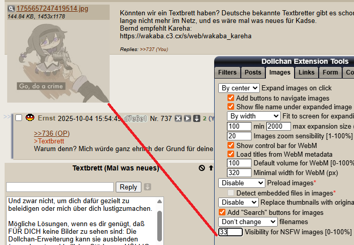 >>737 Und zwar nicht, um dich dafür gezielt zu beleidigen oder mich über dich lustigzumachen. Mögliche Lösungen, wenn es dir genügt, daß FÜR DICH keine Bilder zu sehen sind: Die Dollchan-Erweiterung kann sie ausblenden (sogar in unterschiedlicher Stärke von VÖLLIG bis NUR SO EIN BISSL). Da bleibt der Rest dann auch ganz normal. Oder "reader mode", geht im Feuerfuchs von Haus aus, Chrome und Abkömmlinge brauchen dafür eine Erweiterung. Da bleibt dann nur Text, die Formatierung geht ebenfalls verloren.