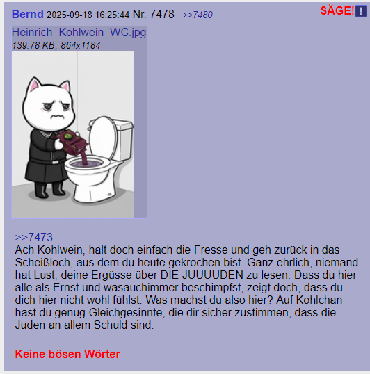 Seriös? >>7478 >Keine bösen Wörter Soll das ein Witz sein? Oder hast du nicht mehr alle Tassen im Schrank? Was sind denn "böse Wörter"?