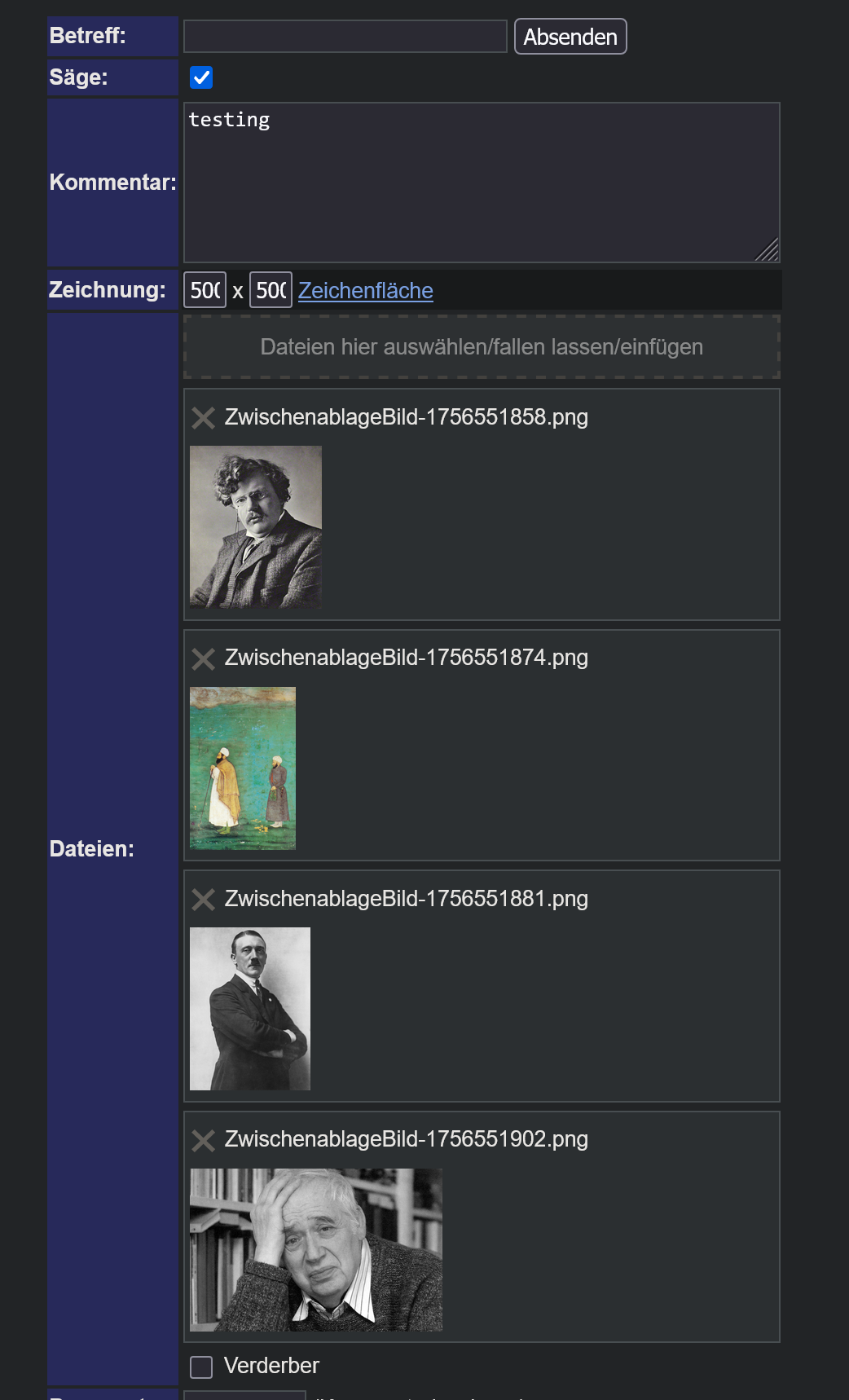 >>311 See? I tried to copy four normally sized images and it wouldn't send the post. They're not even high resolution. Here are the image links I tried: https://i.4cdn.org/lit/1756503334985064.png https://i.4cdn.org/lit/1756410970381622.jpg https://i.4cdn.org/lit/1756107913597550.jpg https://i.4cdn.org/lit/1756491122930504.jpg