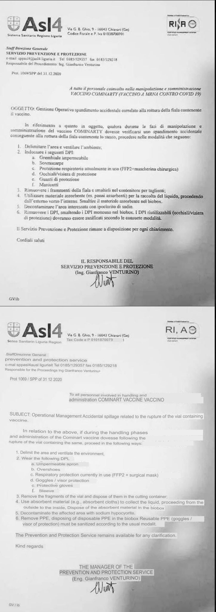 Instruction from Italy in situation of accidental spillage during the handling and administration of the "covid vaccine" just leaked. It orders to deal with it as if it was a highly toxic substance: decontamination protocol for toxic substances must be fully carried out. https://x.com/AnwaltUlbrich/status/1985130430161445295 But injecting it into humans was/is fully safe, of course.