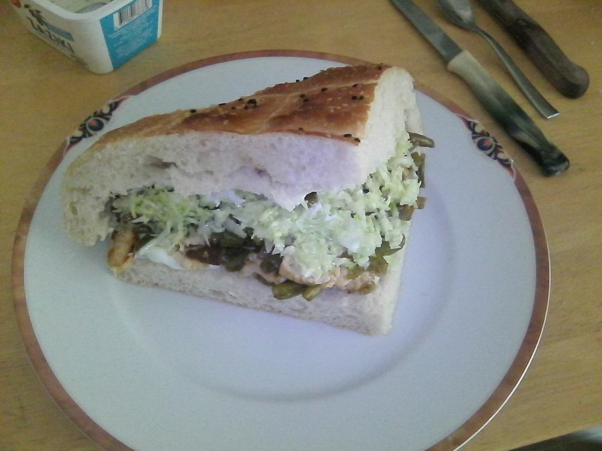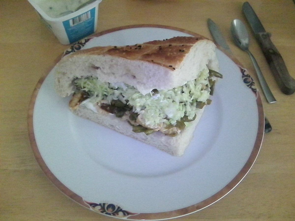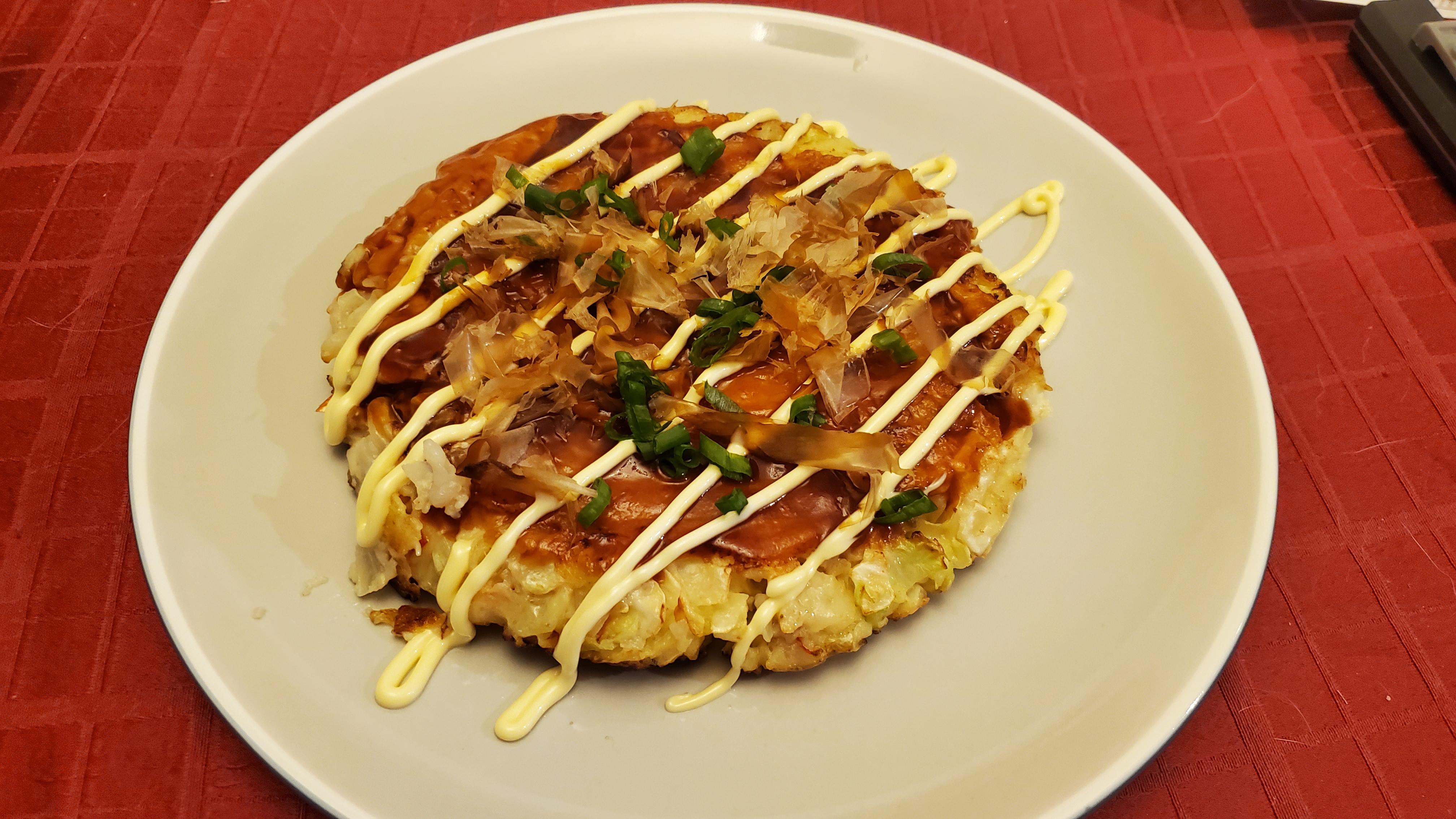 Okonomiyaki a la Bernd Zutaten: 165 g Mehl 200 ml Wasser 1 Päckchen Dashipulver 2 Eier 220 g Kohl 120g fein geriebene Kartoffeln ca. 2TL Margarine Eine Frühlingszwiebel, fein gehackt. 2 Scheiben vorgeschnittene Salami, in dünne streifen geschnitten. Nach Bedarf: Okonomiyaki-Sauce (Ketschup, Austernsauce, Sojasauce, Zucker) Mayonnaise Aonori Bonitoflocken Zubereitung 1. Den Kohl in 7 mm große Würfel schneiden. 2. Mehl, Wasser, Dashi, Ei und geriebene Kartoffel in einer Schüssel mit einem Mixer verrühren. Den Kohl hinzufügen. 3. Den Teig verrühren und in einer Pfanne mit Öl bei mittlerer Hitze ausbacken. Auf der einen Seite 6 Minuten, auf der anderen 7 Minuten braten. Nochmals wenden und 1 Minute braten. (Jetzt schon mit Topings belegen, in diesem Fall: Salamistreifen.) 5. Mit Sauce und Mayonnaise belegen, mit Frühlingszwiebeln bestreuen, traditionell jetz Mit Bonitoflocken und Aonori bestreuen, ich lasse das oft wek, weil nicht so leicht zugänglich und außerdem verwende ich es dann zu selten.