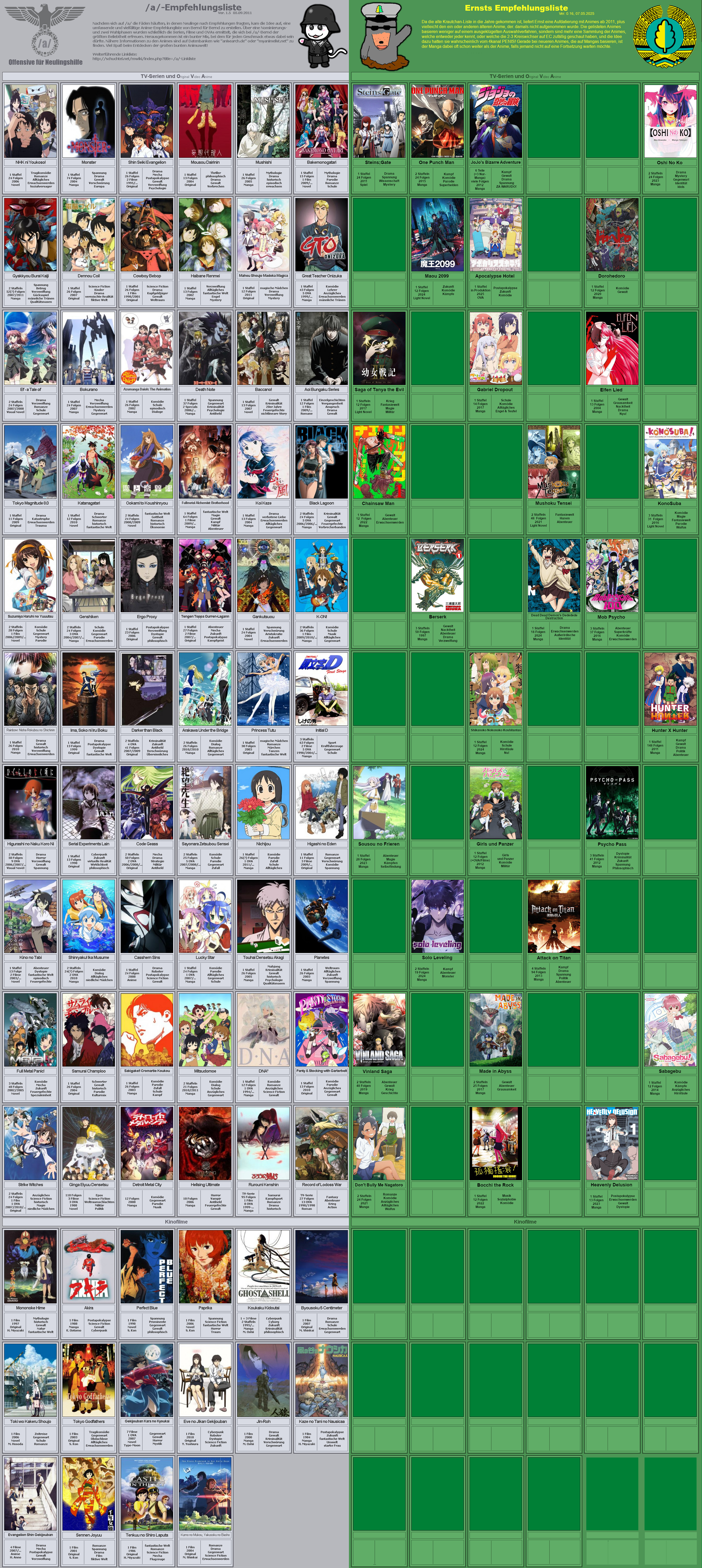 Bernd erinnert sich vielleicht noch an die Animu-Empfehlungsliste, die 2011 auf KC erstellt wurde. Bernd wollte das Projekt im Jahr 2025 wieder aufleben lassen, aber auf EC gab es dafür zu wenig Animuschuchteln. Nicht, dass die Welt sowas zwingend braucht, solche Listen gibt es wie Sand am Meer. Aber keine von Bernd für Bernd. Hätte Bernd Interesse, das Projekt weiterzuführen? Farben und alles müsste Bernd natürlich jetzt an die neuen Gegebenheiten anpassen. Bisher sind zum Großteil die Sachen drauf, die Bernd selbst gesehen und für gut befunden hat. Aber Bernd sitzt naturgemäß in seiner eigenen Filterblase, und kriegt von manchen Genres wahrscheinlich gar nichts mit, es wäre also schön, wenn mehr Bernde mitmachen. Apocalypse Hotel hatte Bernd nach den ersten paar Folgen draufgesetzt, das würde er wieder runternehmen wollen, weil das so hart abgebaut hatte - was Bernd immer noch mett macht bei dem Weg.