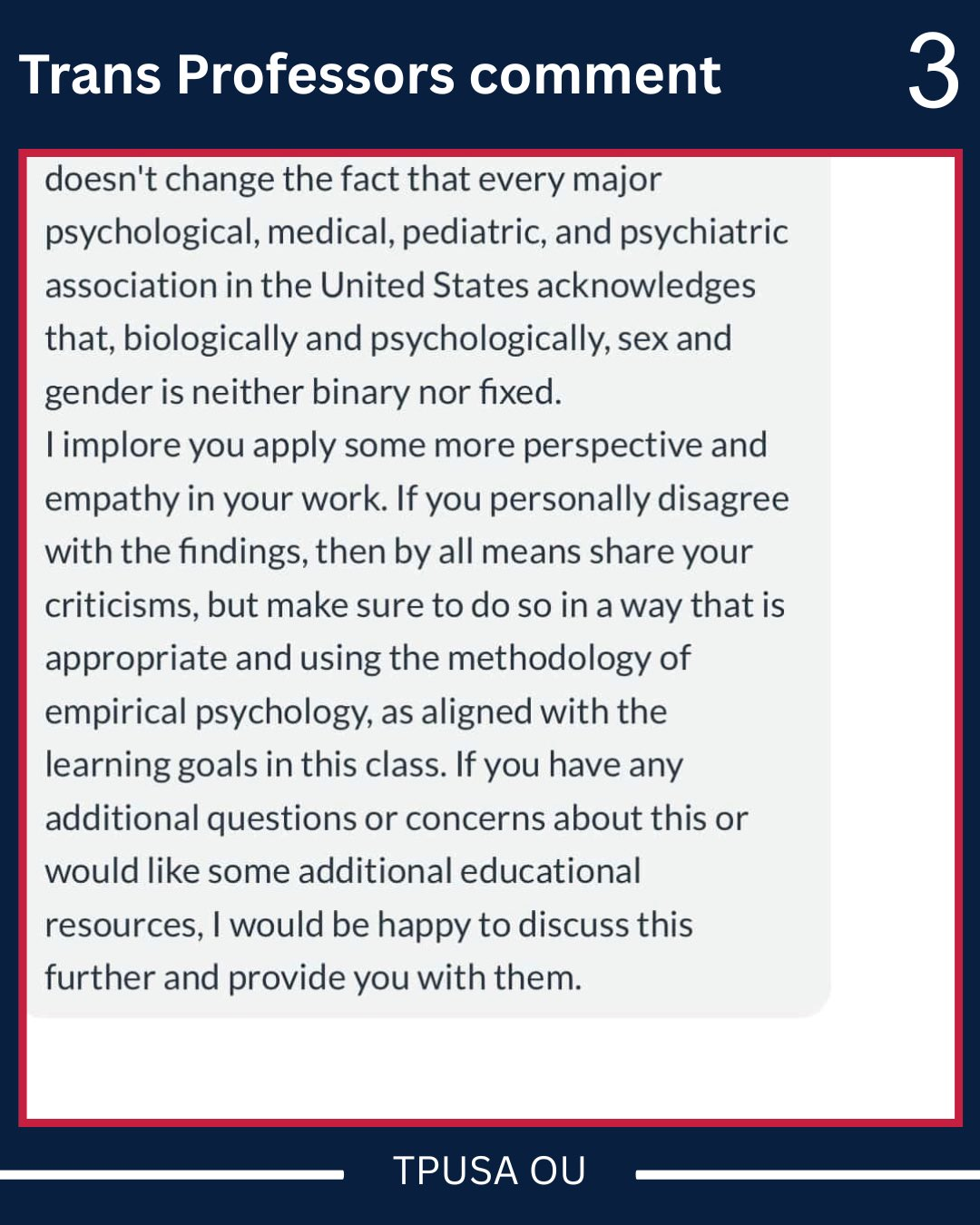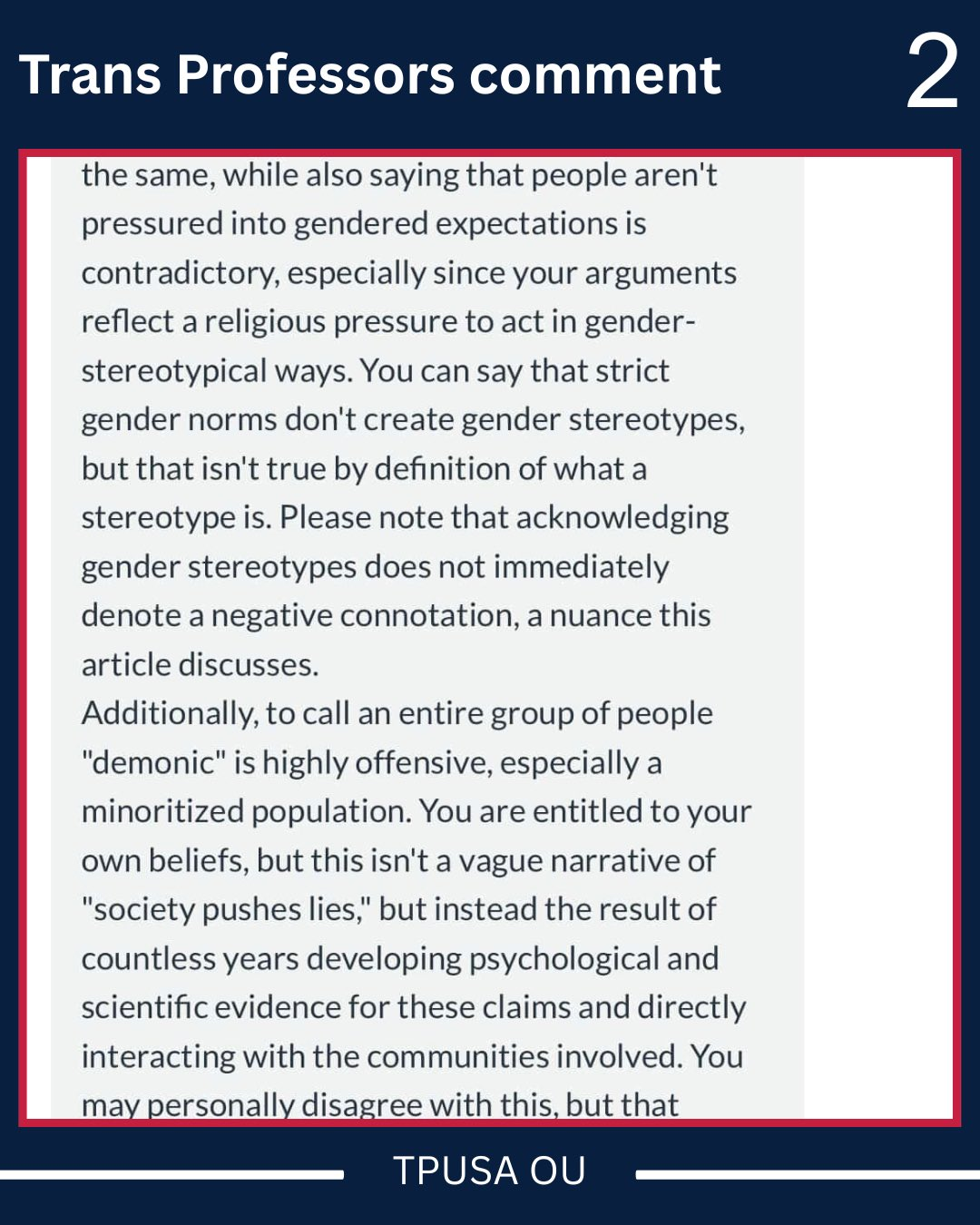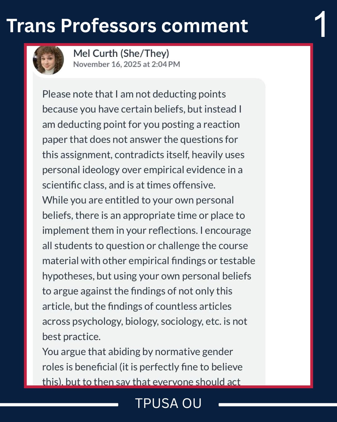 Oklahoma is the most religious conservative state apart from Utah. I am sure a significant portion of the bachelor's level students hold similar views as her. The TA is correct that it doesn't take a scientific approach to gender, but it does make an argument and uses a source (the Bible). I don't agree with the TA either, they start off saying that they are not taking off points because of the argument then gives the paper a 0 and heavily criticized the argument. The student also filed a religious discrimination complaint and had the TA suspended... I don't know, it seems both the TA and student need some training on what is expected of them...