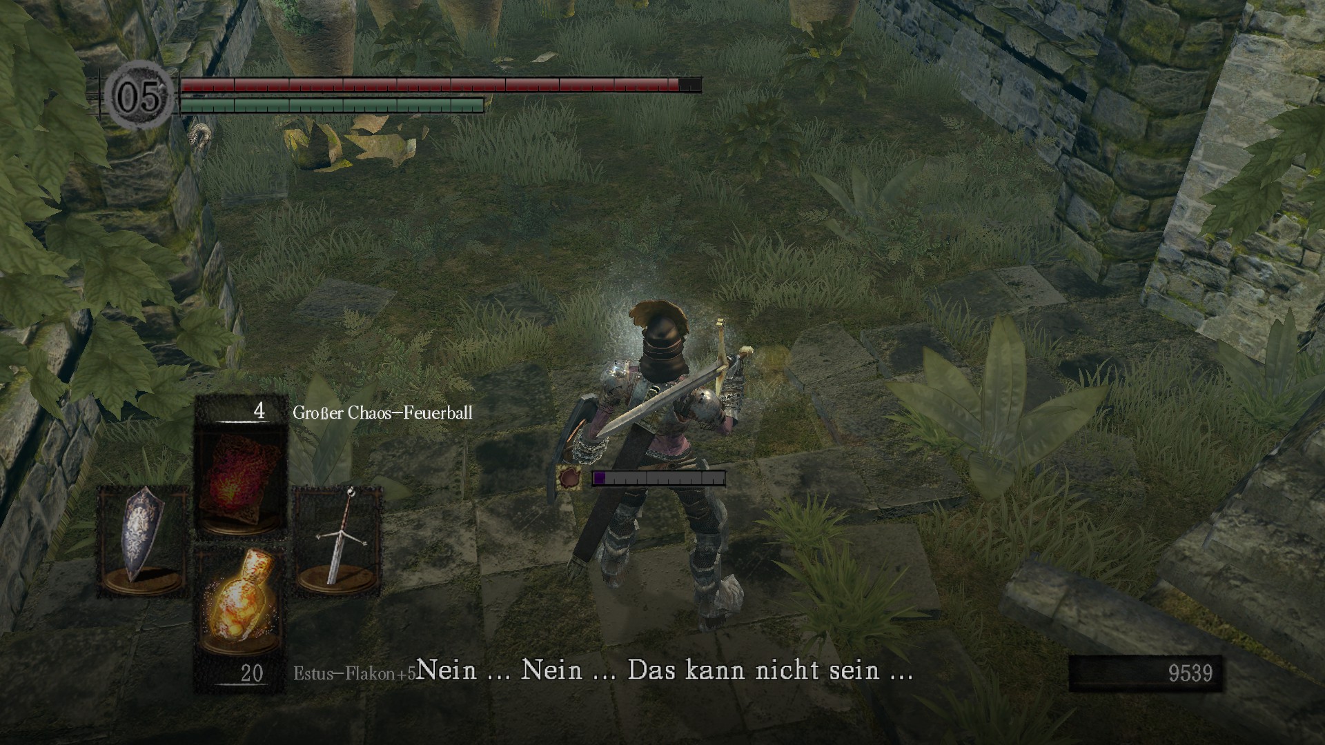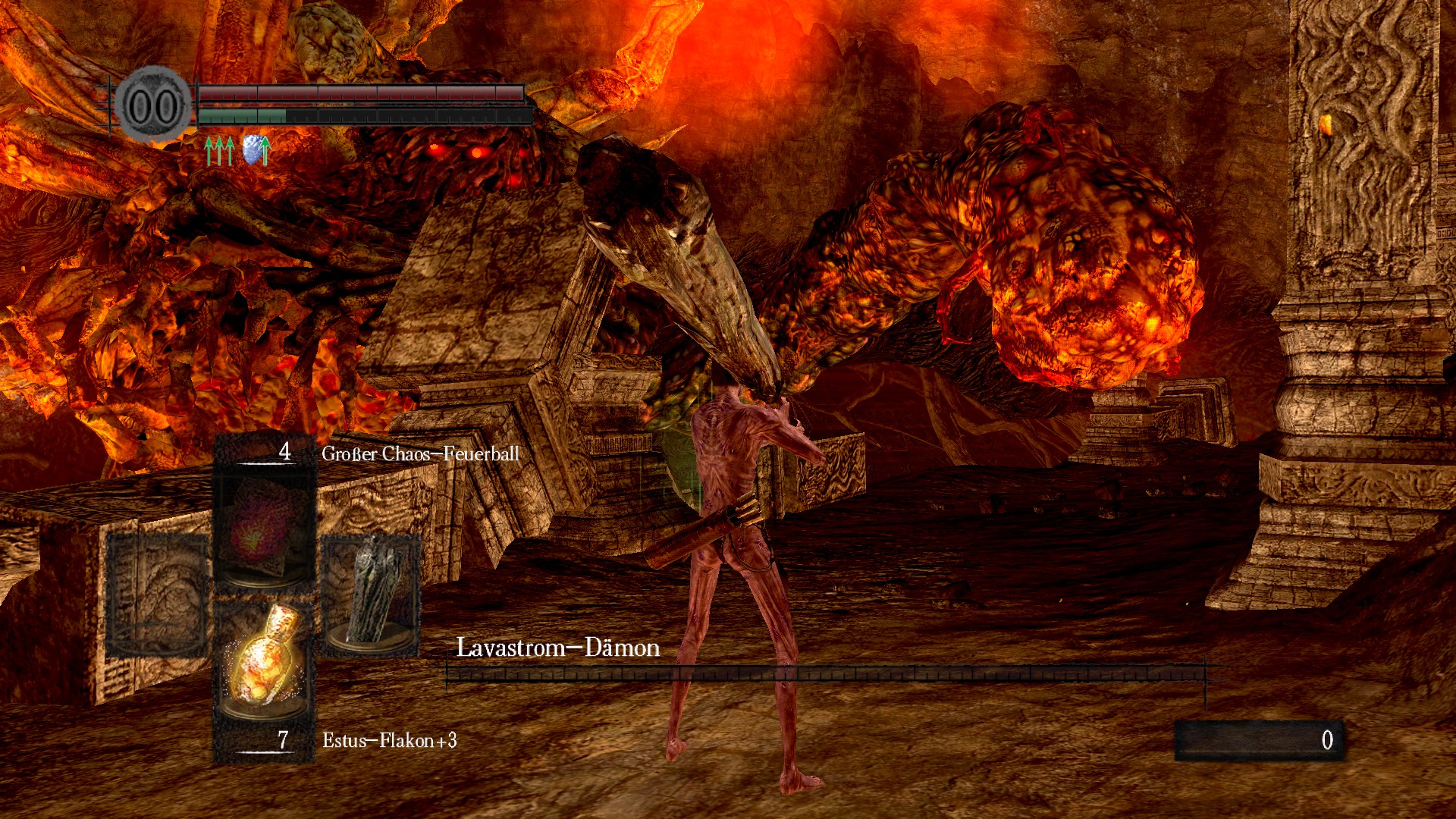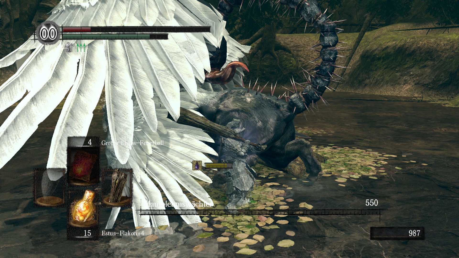 Weiter ging es in die Dämonenruinen. Den komischen flammenden Fettsack totgeschlagen, die Abkürzung zur Queelag-Domäne freigeschaltet und aktuell den Tausendfüßlerdämon am bekämpfen. Bernd muss wohl wieder auf Schnellrollen umsteigen, weil er ständig totgeschlagen wird, wenn er nach dem ersten Treffer einen trinken will. >>427 > evtl was extrem EinSchuss mäßiges? Wie z.B.? Bernd war ja zu dem Zeitpunkt schon mit seiner Großkeule +14 unterwegs. Bernd ist am überlegen speziell für SL1, da er da auch noch einen angefangenen Lauf von vor Jahren hat.