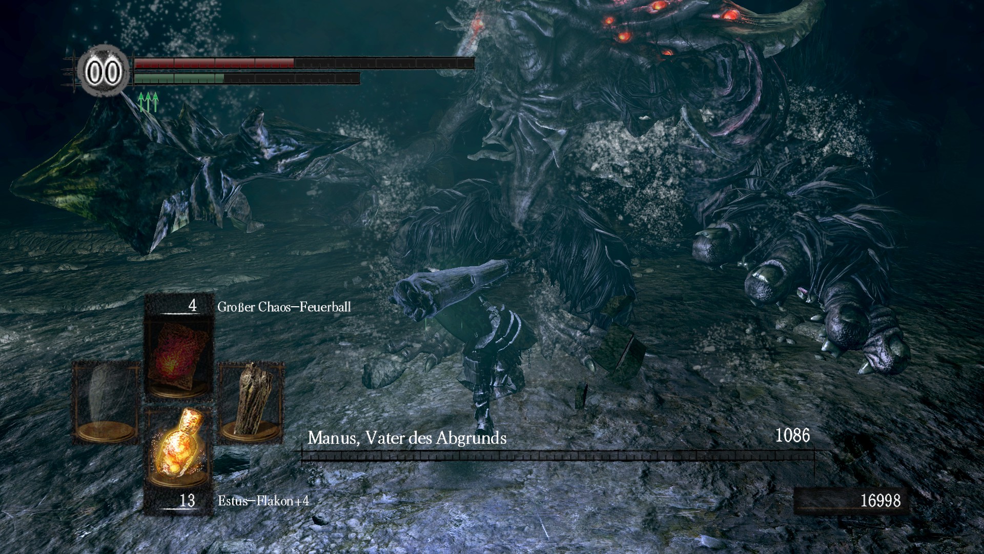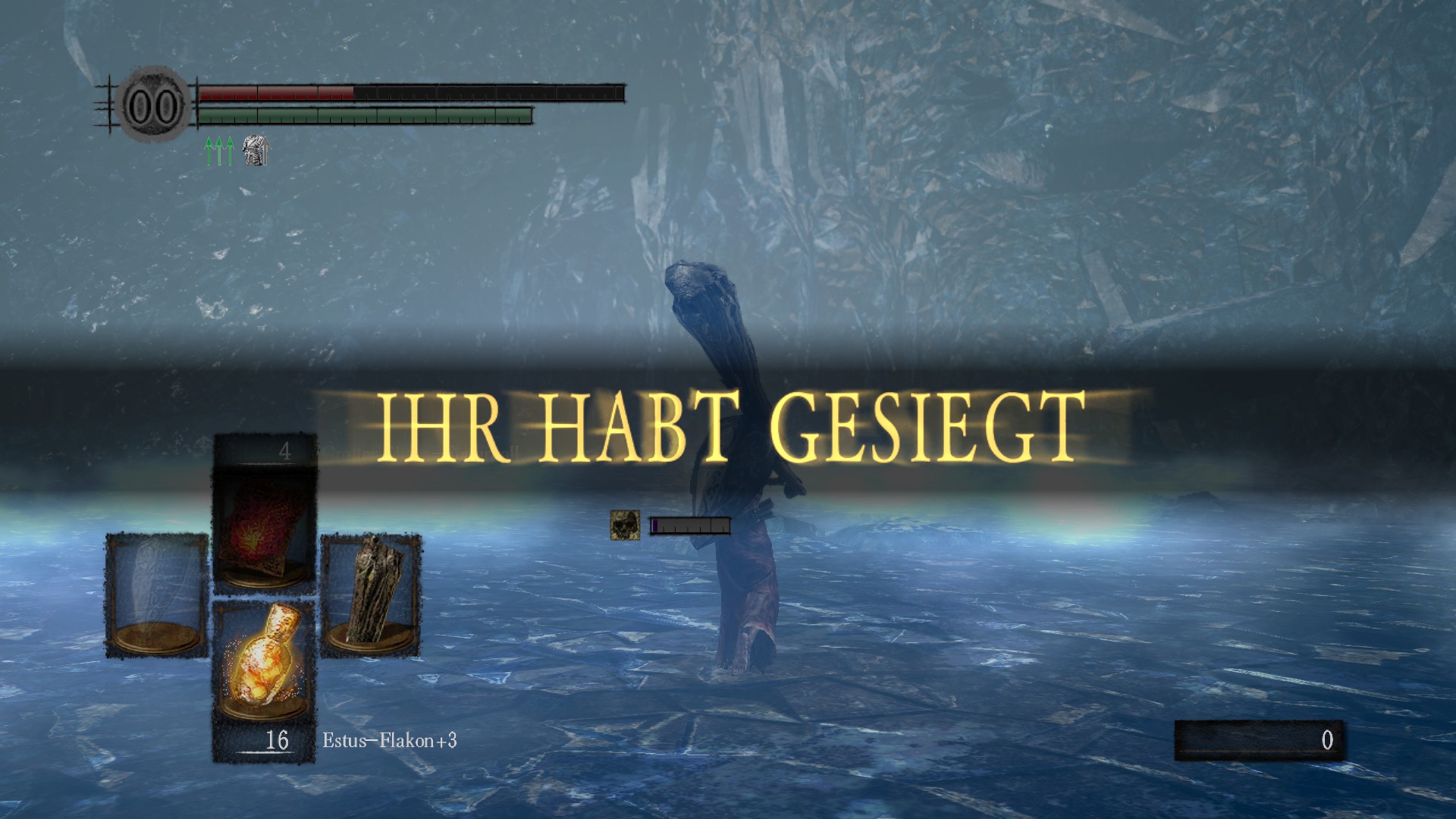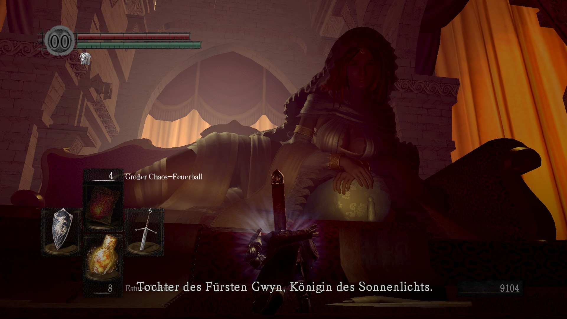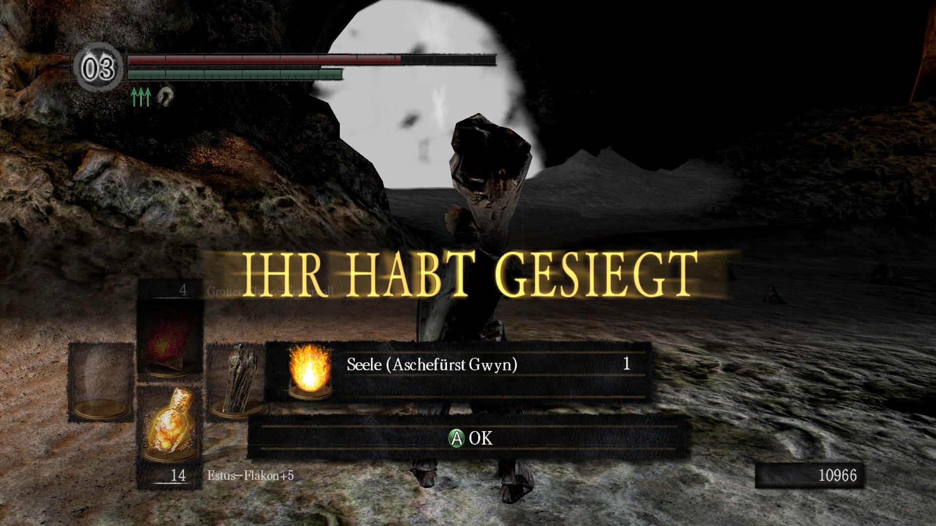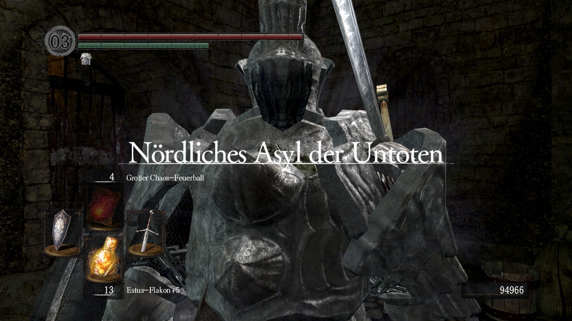Bernd hatte jetzt einfach keinen Bock mehr, er wollte fertig sein. Das heißt Herrschergefäß gefüttert, Tür aufgemacht, den Gwyn beim ersten Versuch zum Verliryn gemacht - Keule regelt härter als sonstwas - und das Feuer entzündet. Jetzt hat Bernd im NG+ den Asyldämon in drei Schlägen gelegt und ist wieder am Feuerbandschrein. Wahrscheinlich wird er jetzt nochmal eine Pause machen und dann in fünf bis zehn Jahren weiterspielen.