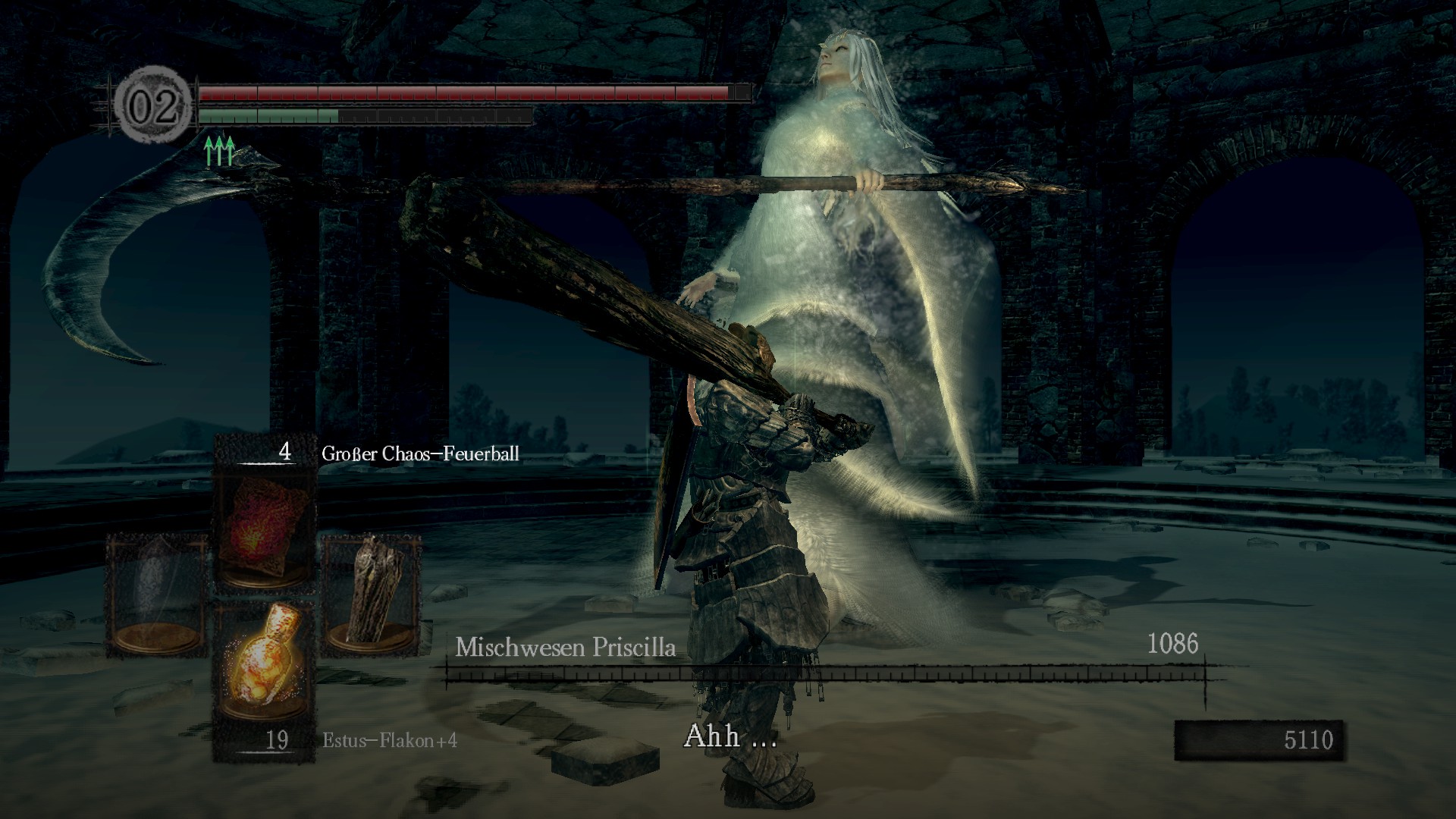 Bernd hat Priscilla jetzt doch gelegt. Bernd ist etwas langsam und deshalb ist ihm aufgefallen, dass die ganzen Bossschwanzwaffen ja in NG potentiell einfacher zu holen sind als später, was ihm besonders wegen Klaffdrachen und Seath stinkt. Nun ja, da in diesem Durchlauf ja im Grunde nur noch der Gywn übrig ist, wird jetzt halt mal aufgeräumt. Deshalb hat Bernd dann auch der blöden Schwuchtel Wendelin mal so richtig in seine fiese Fresse gehauen, aber echt mal jetzt, Junge. Danach wurde aber leider die Dame am Anor-Londo-Leuchtfeuer ein bisschen zickig und musste auch ruhiggestellt werden. Bernd hatte zwar eh vor, sich ihre Seele zu holen, aber noch nicht unbedingt so früh. Naja, isso. Und weil Bernd gerade so im Blutrausch war, hat er dann auch noch grad dazu Patches erledigt. Aber der hatte es eh verdient. Was bleibt jetzt also noch in diesem Durchlauf an wichtigen Sachen? Eigentlich nur Kalameet als "richtiger" Boss vorm Finale und vielleicht noch ein wenig Kroppzeug sonstwo, was irgenwelche Schätze bewacht.
