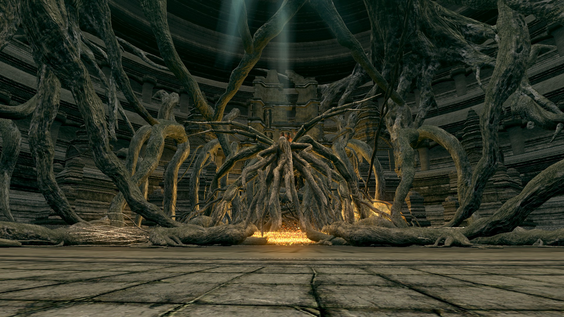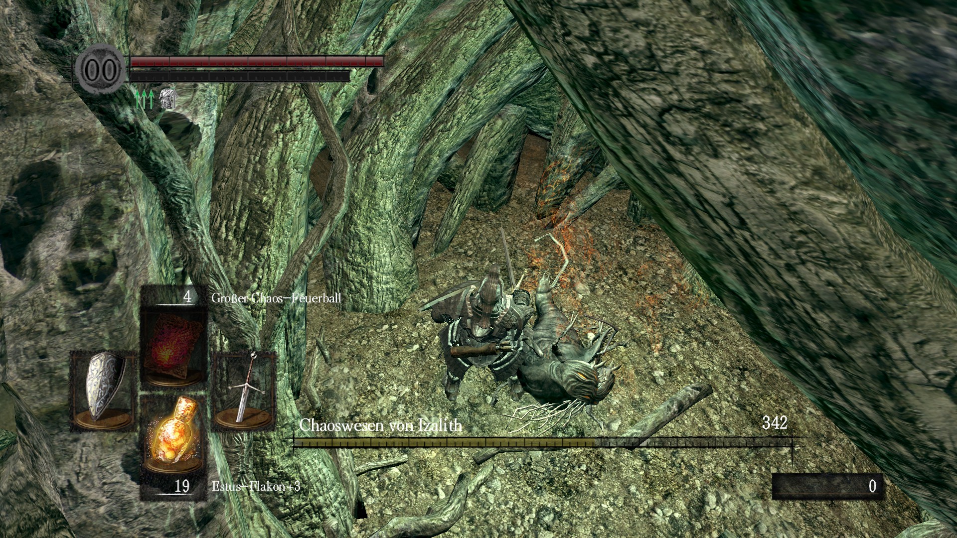 Chaoswesen jetzt auch tot. Nachdem die rechte Wurzel dann man kaputt war ist Bernd noch einmal in den Abgrund gefallen als er noch keinen halben Meter an der Wurzel vorbeigefallen ist. Ansonsten war die letzte Phase echt kein Problem. Die komischen Feuerklingen haben verfehlt, die Handwischer kann man rausködern und dann weiterrennen und dann war es nur noch ein bisschen durch die Dickung rollen und den hässlichen Dreckskäfer totschlagen. Vorher hat Bernd aber noch dem Zwiebeltyp geholfen in der Grube, sowie einen besessenen Solaire erledigt. Jetzt geht es zu dem Nacktmull.