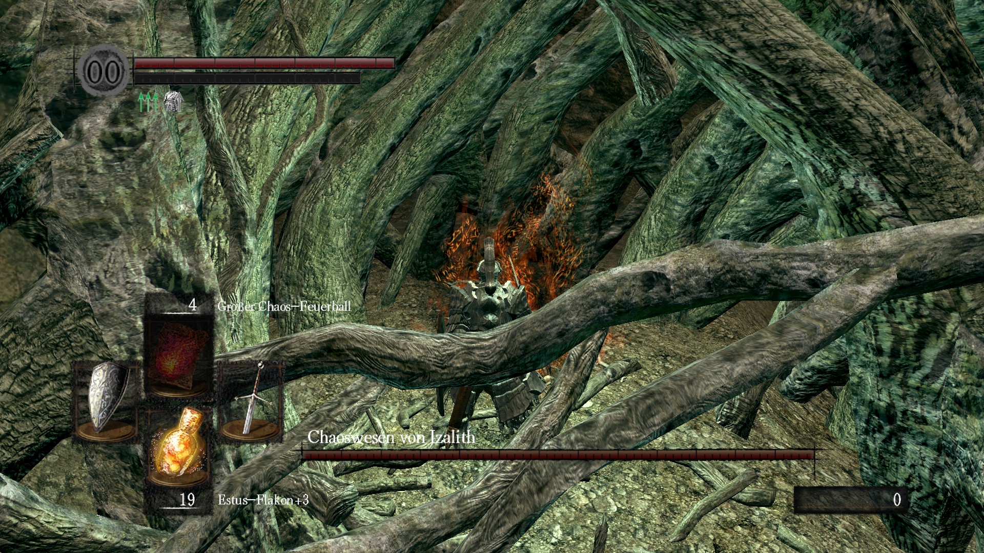 Gerade ist Bernd bei dem Chaoswesen angekommen. Bernd dachte er sei kluk und macht die Wurzeln von Weitem kaputt. Leider hat er mit der linken Wurzel angefangen und nun festgestellt, dass er für die rechte Wurzel sich doch v.a. der Wischattacke aussetzen muss, die ihn in den meisten Fällen in den Abgrund schiebt. Das hat er jetzt ein paarmal als reines Dörrfleisch gemacht, aber als nächstes versucht das doch noch mal zu panzern. Das gesamte Izalithlevel ist ohnehin irgendwie doof. Einfach nur ein paar gammlige Ruinen mit tausend Dämonenstatuen und Töpfen mit lustigen Soundeffekten, plus die Drachenärsche.